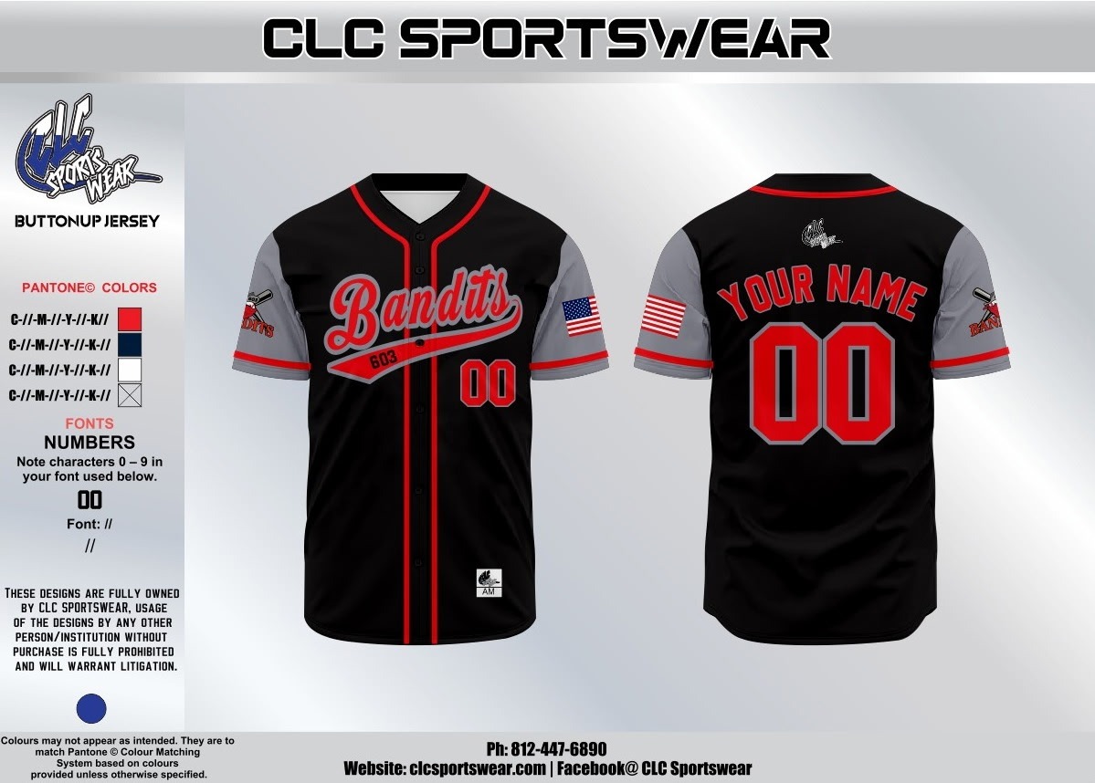 A premium black button-up jersey with red accents, Bandits script on the front, and customizable name/number on the back.