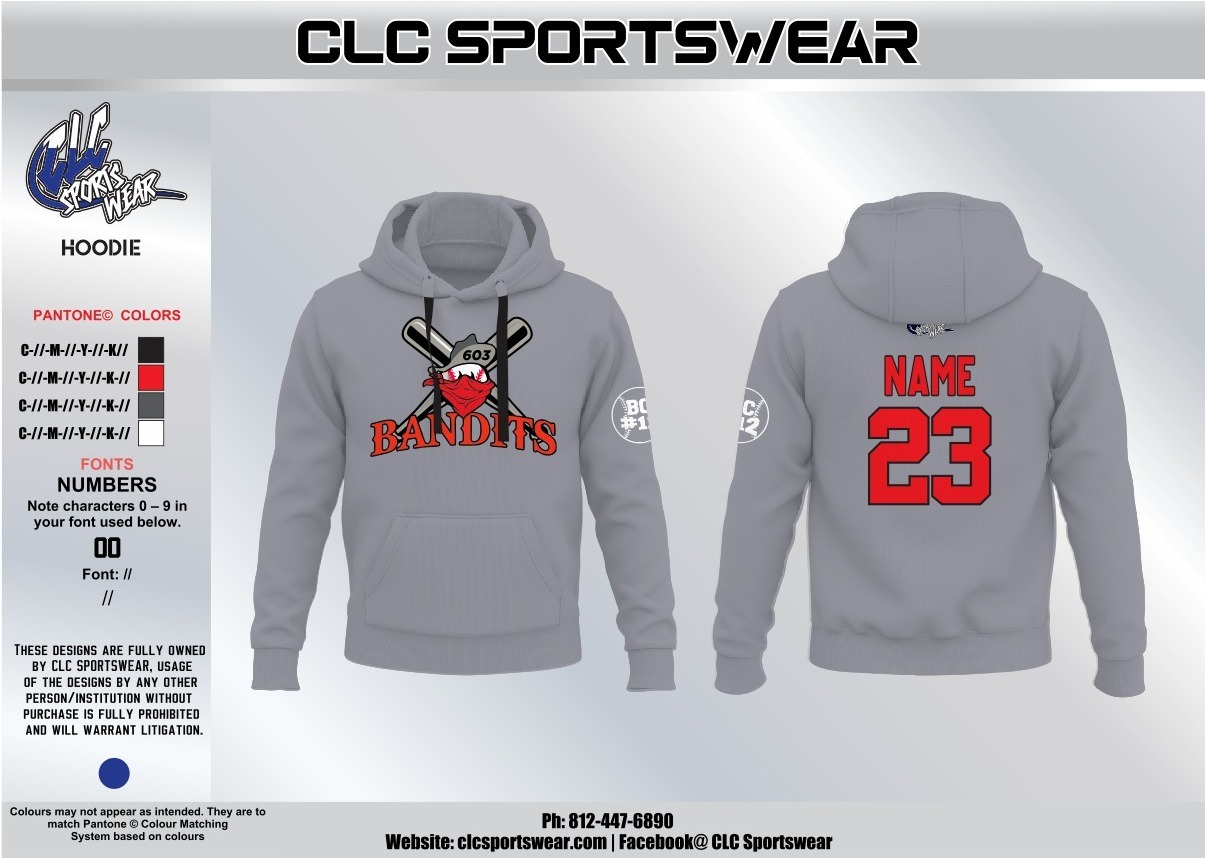 Classic grey pullover hoodie with Bandits front graphic and customizable NAME/NUMBER on the back.