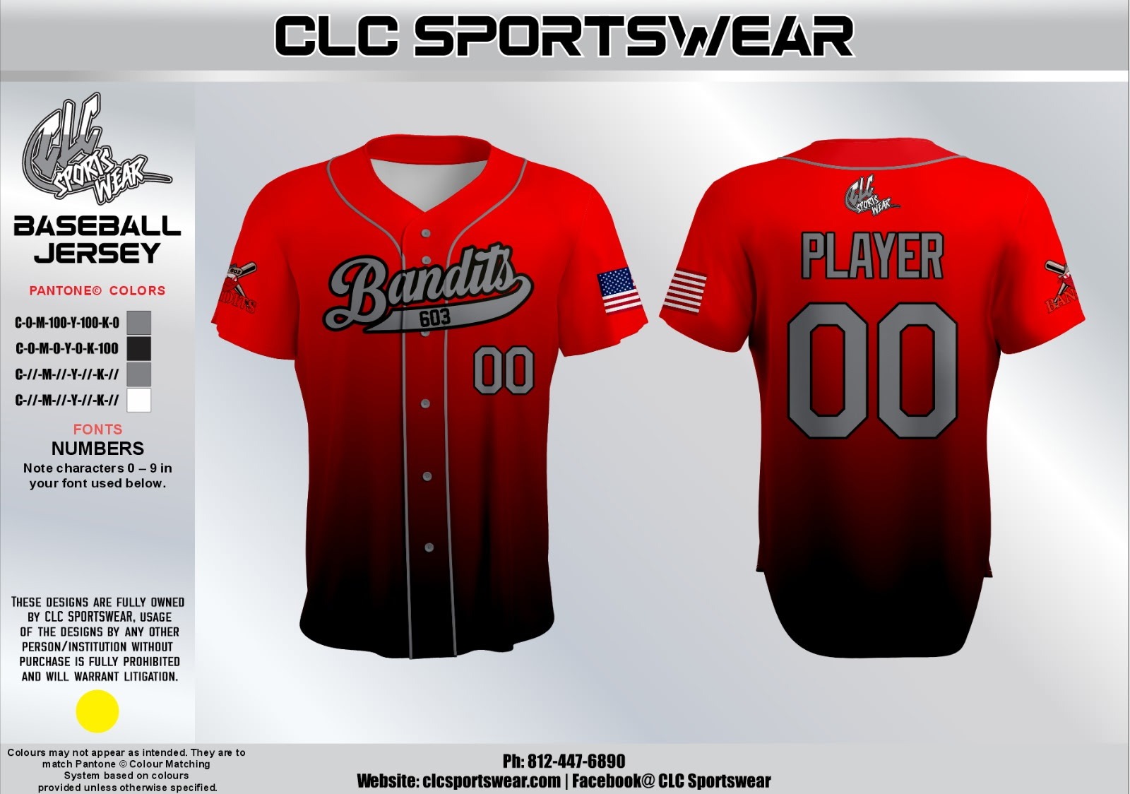 Take the field (or the stands) in unmistakable 603 Bandits style with the Red Gradient Jersey. Designed with a vivid red body that fades into a deep black hem, this jersey puts the Bandits script front and center for a clean, traditional baseball look with a modern edge. Contrast piping and a button-front silhouette keep the aesthetic true to the game, while sleeve accents and shoulder details add extra pop and depth to the design.
