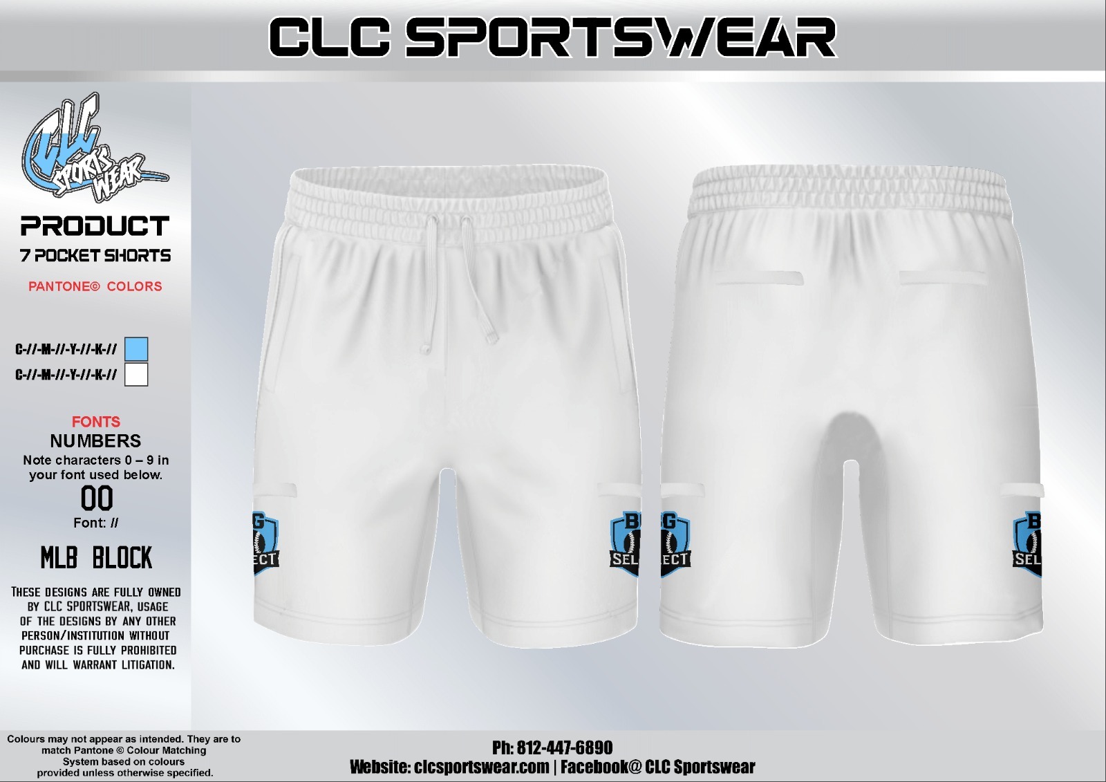 Clean white 7-pocket shorts with BG Select branding—functional training gear for players who demand performance and storage.