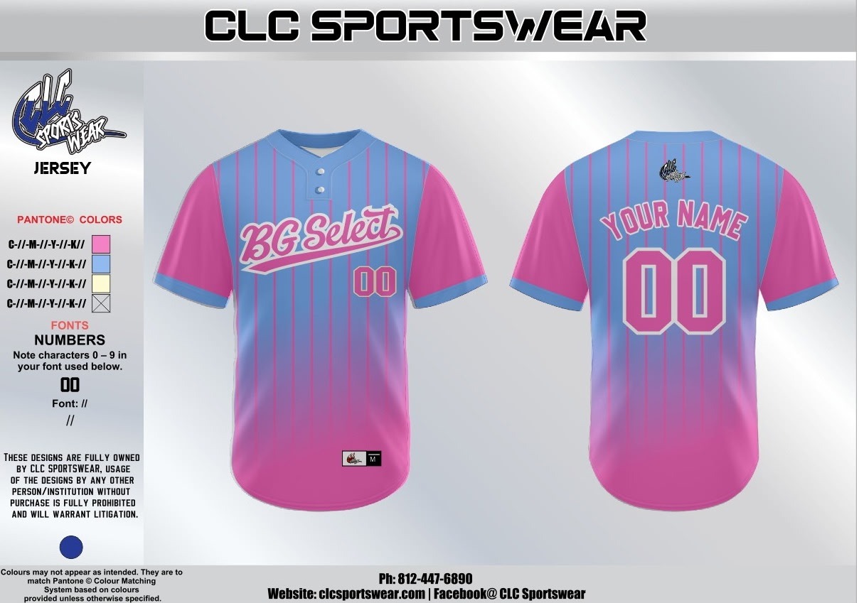 A bold pink-and-blue pinstripe button-up jersey with BG Select branding—built for game day and customizable with name and number.
