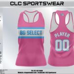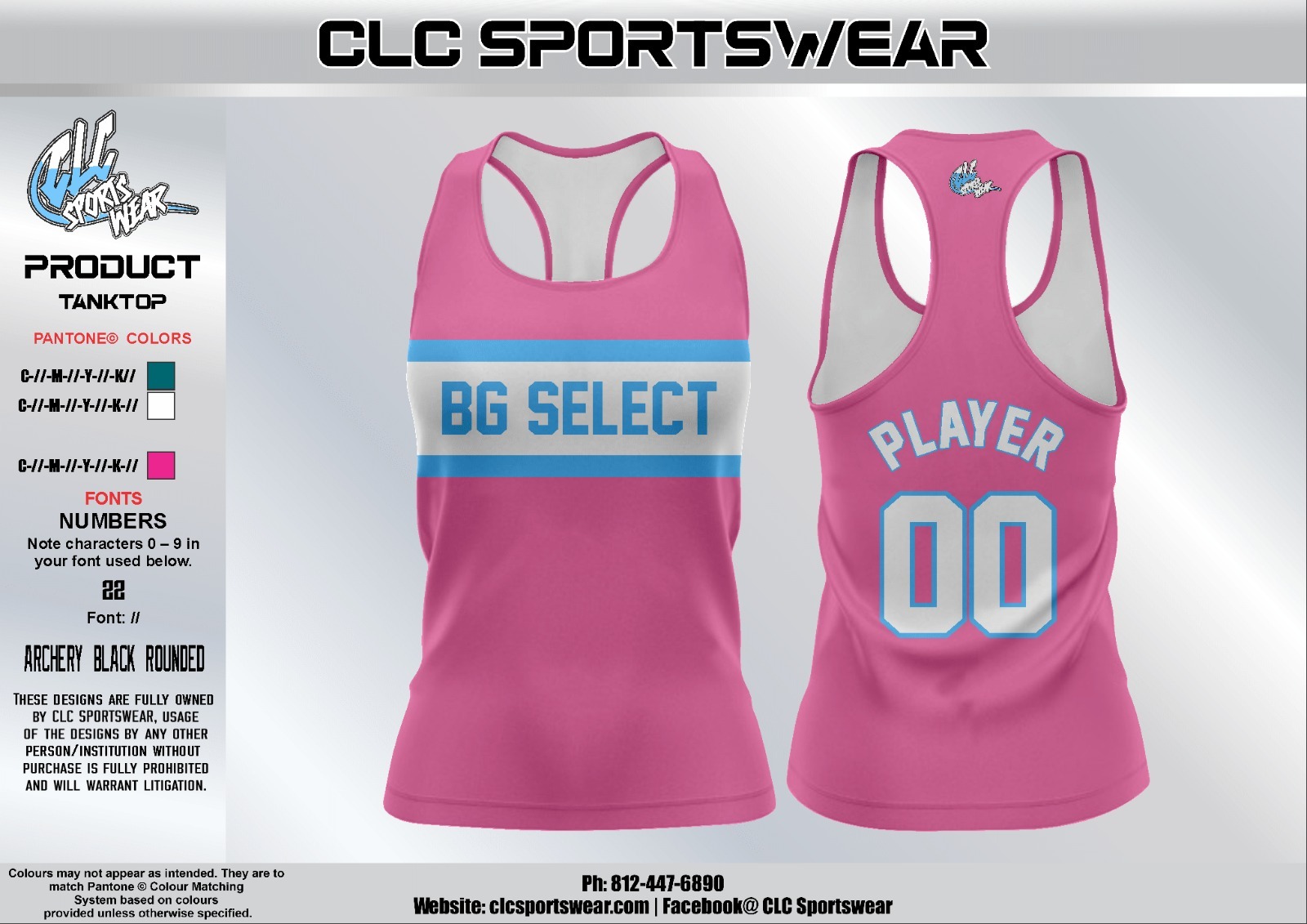 Pink racerback tank with BG SELECT stripe branding and customizable player name/number on backbuilt for warm-weather training.
