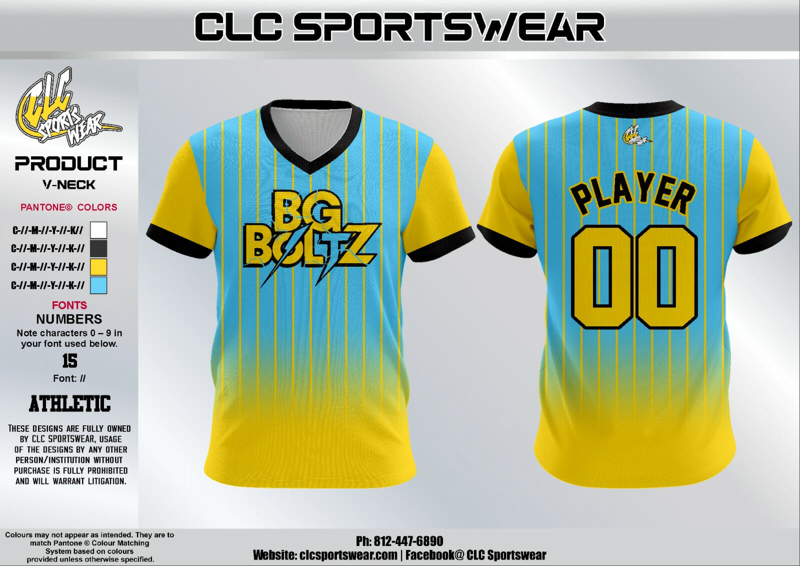 Turn heads in the BG Select “BG Boltz” V-Neck Jersey with a pinstripe gradient fade from lightning blue to gold. The front features the bold BG BOLTZ mark with lightning bolt accents, framed by a classic V-neck collar for a traditional jersey feel with a modern upgrade. On the back, “PLAYER” and a large two-digit number block provide the perfect space for personalization—ideal for full-team orders, tournaments, and branded travel sets.