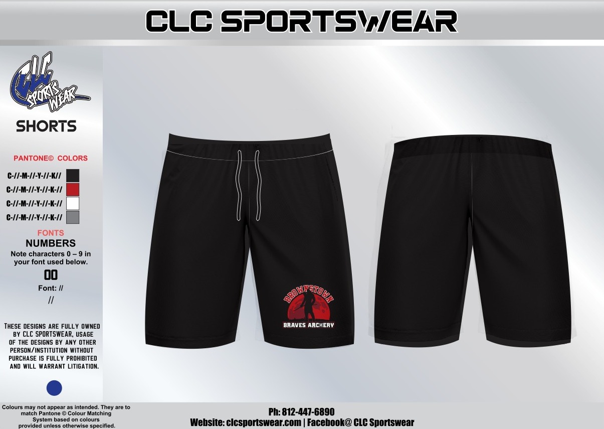 Designed by CLC Sportswear with athletes in mind, these shorts offer unrestricted movement and superior comfort. The modern athletic cut provides optimal range of motion for archery practice, training, or any physical activity. Deep side pockets offer convenient storage for small essentials, while the durable construction withstands rigorous use and frequent washing. The black colorway provides a versatile, professional appearance that coordinates perfectly with other Brownstown Braves team apparel. High-quality screen-printed graphics ensure the team logo remains vibrant and intact through countless wears and washes.