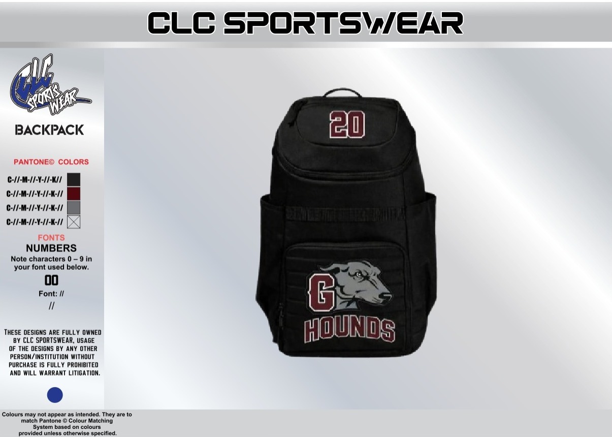 Carry your game-day essentials in style with the Hounds Football Backpack (Black). This sleek black backpack features the bold G Hounds greyhound mascot logo on the front pocket and a customizable number panel on the top flap for a personalized, program-issued look. Multiple compartments provide organized storage for apparel, accessories, water bottles, and smaller gear items, making it ideal for practice days, travel, and school.