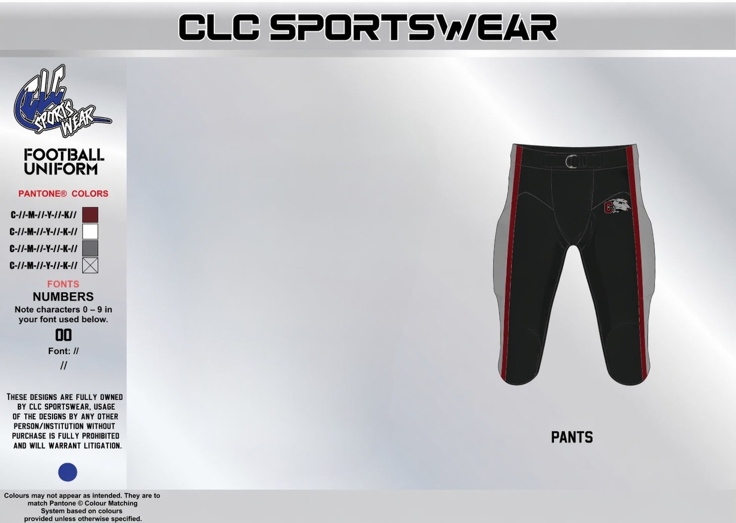 Hounds Football black player pants with red striping, gray side panels, and team logo detail for a bold alternate uniform look.