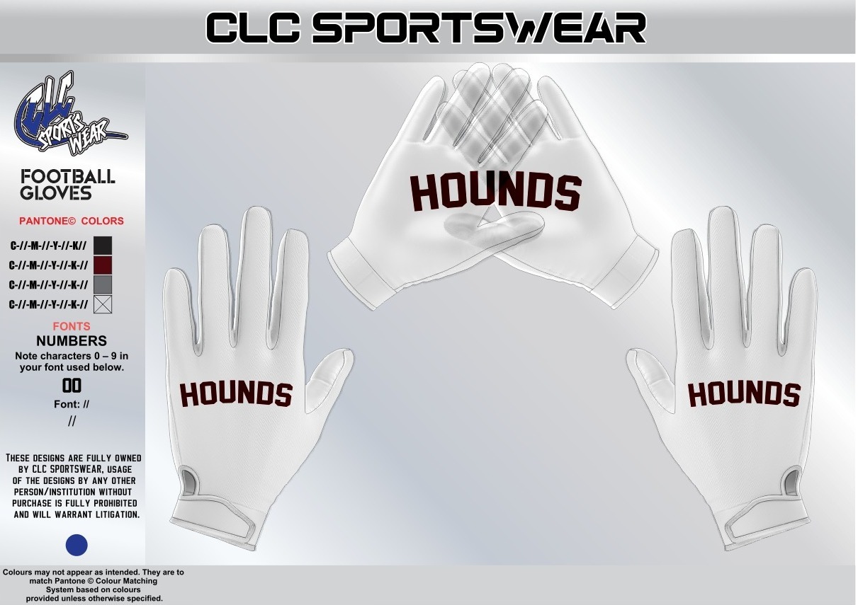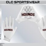 Clean, game-ready Hounds Football gloves in white with bold HOUNDS branding—built for confident catches, crisp routes, and secure ball control.