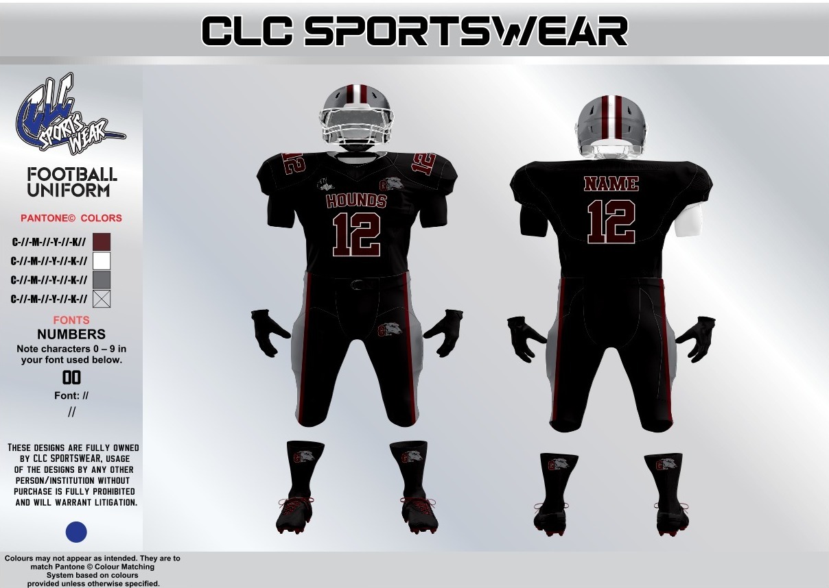 Made for competitive play, the uniform styling supports a secure, athletic fit and a streamlined profile from shoulder to ankle. The design is built to integrate smoothly with standard football equipment—pads, belts, and accessories—while keeping the Hounds identity front and center. Ideal for rostered players, team orders, and program-level uniform refreshes.
