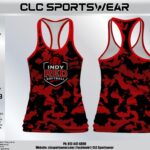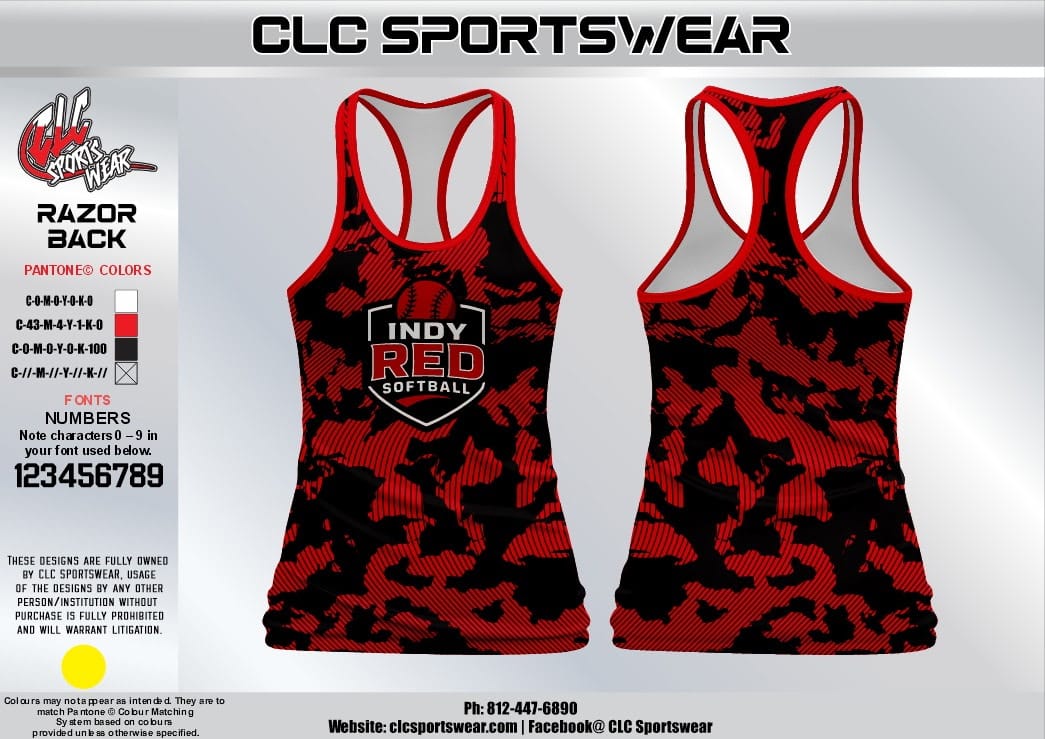 Razorback performance tank with red/black camo pattern and Indy Red Softball crest on the front.