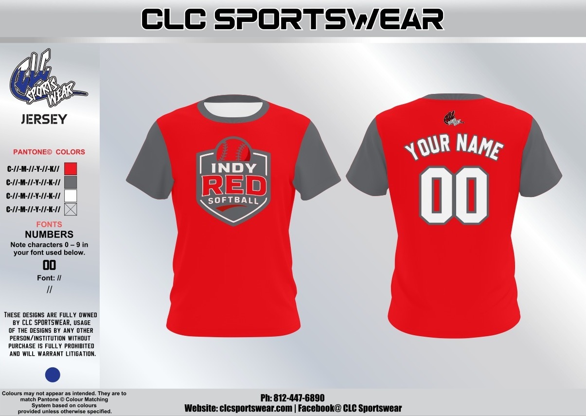 Jersey-style tee with Indy Red Softball crest, red body and grey sleeves; customizable name and number on the back.
