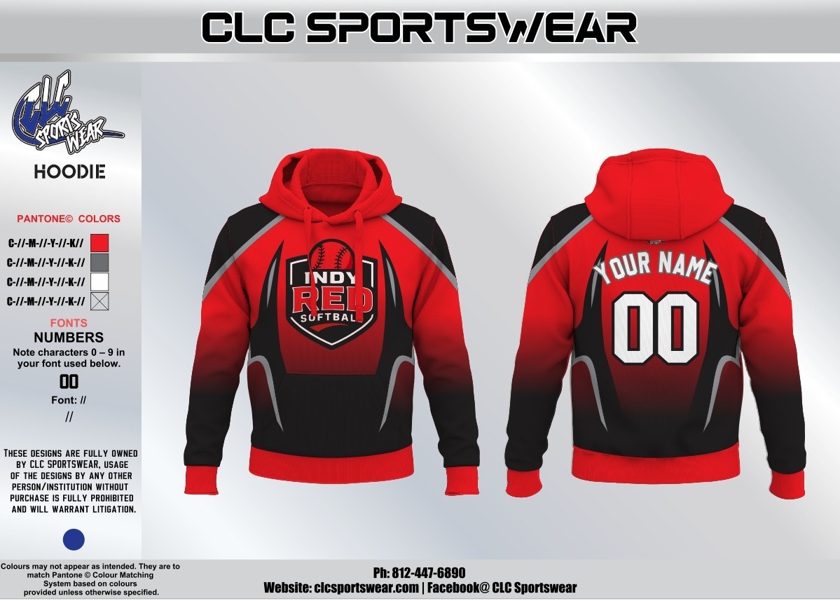 Pullover hoodie with Indy Red Softball crest and bold red/black panel graphics; customizable name and number on the back.