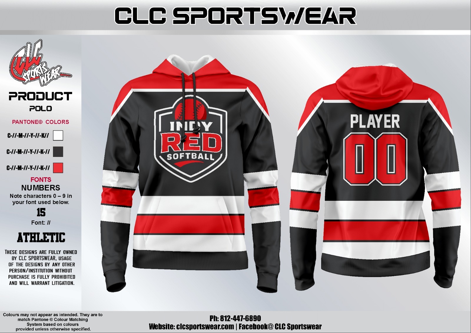 Pullover hoodie with Indy Red Softball crest and bold horizontal stripe design; customizable name and number on the back.