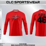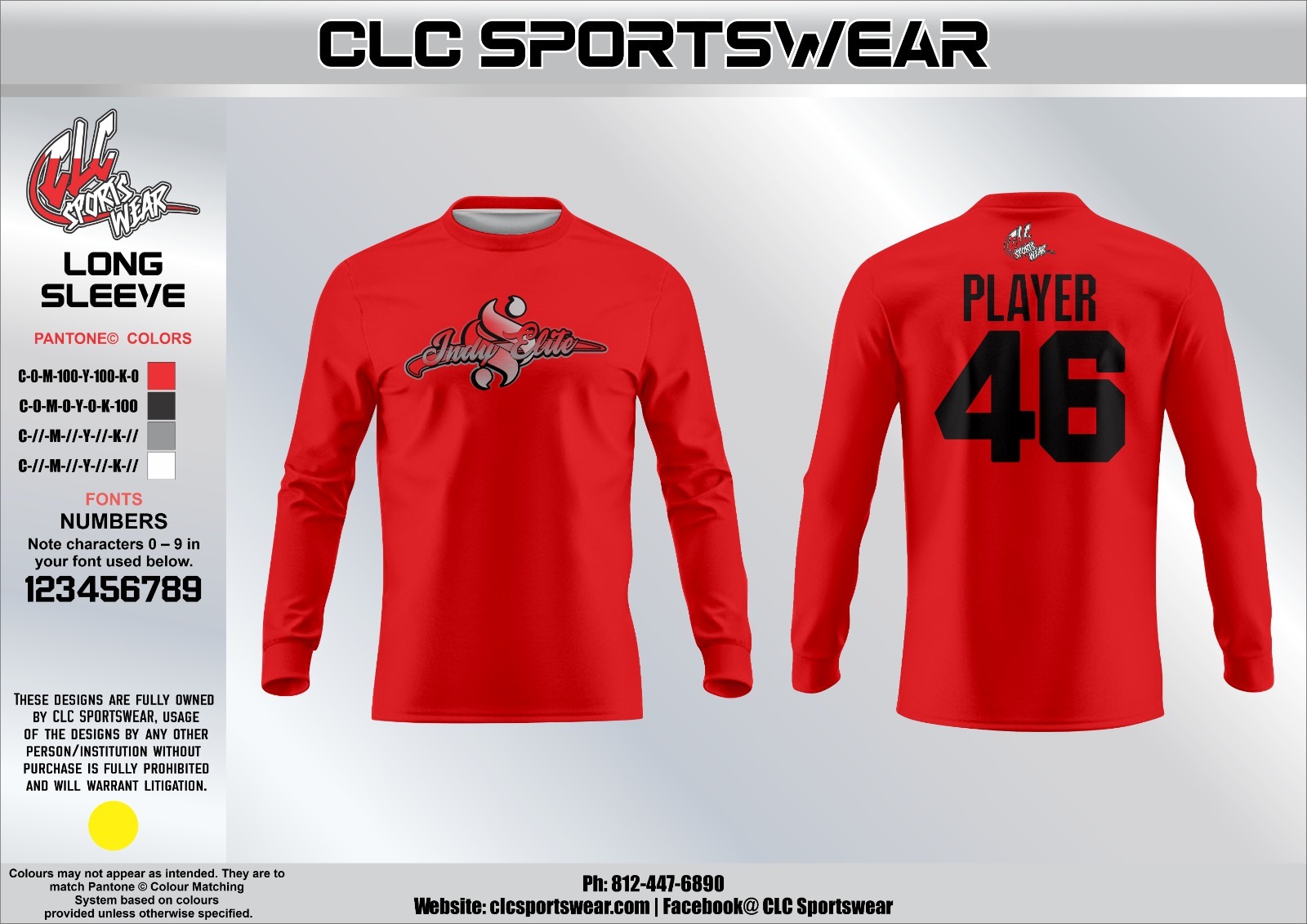 Vibrant red Cotton long sleeve with the Indy Elite script logo in grey and black. Classic team styling with black back numbers.