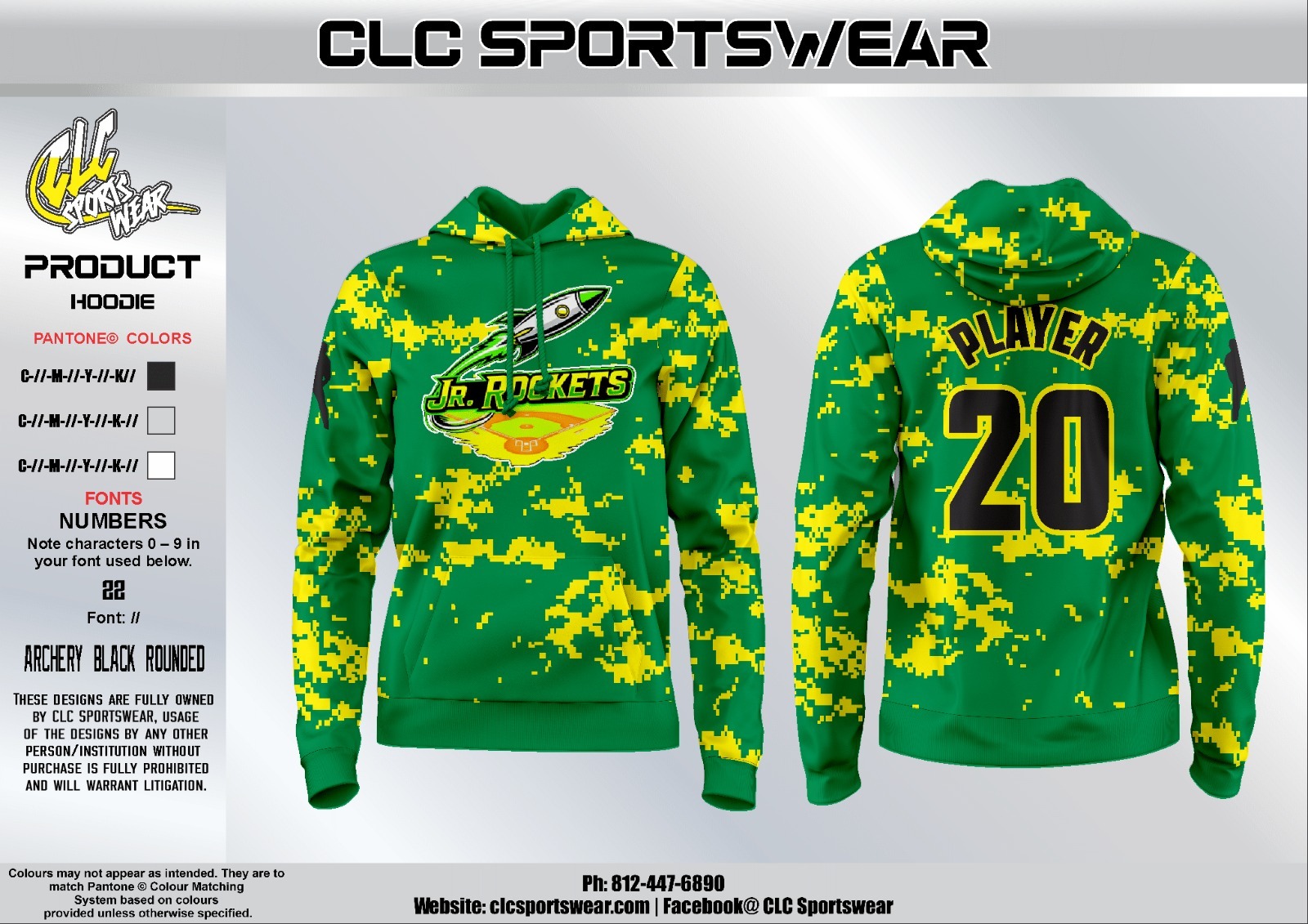 Fully sublimated Jr. Rockets Baseball hoodie in green and yellow digital camo with team logo on front and customizable player name/number on back.
