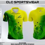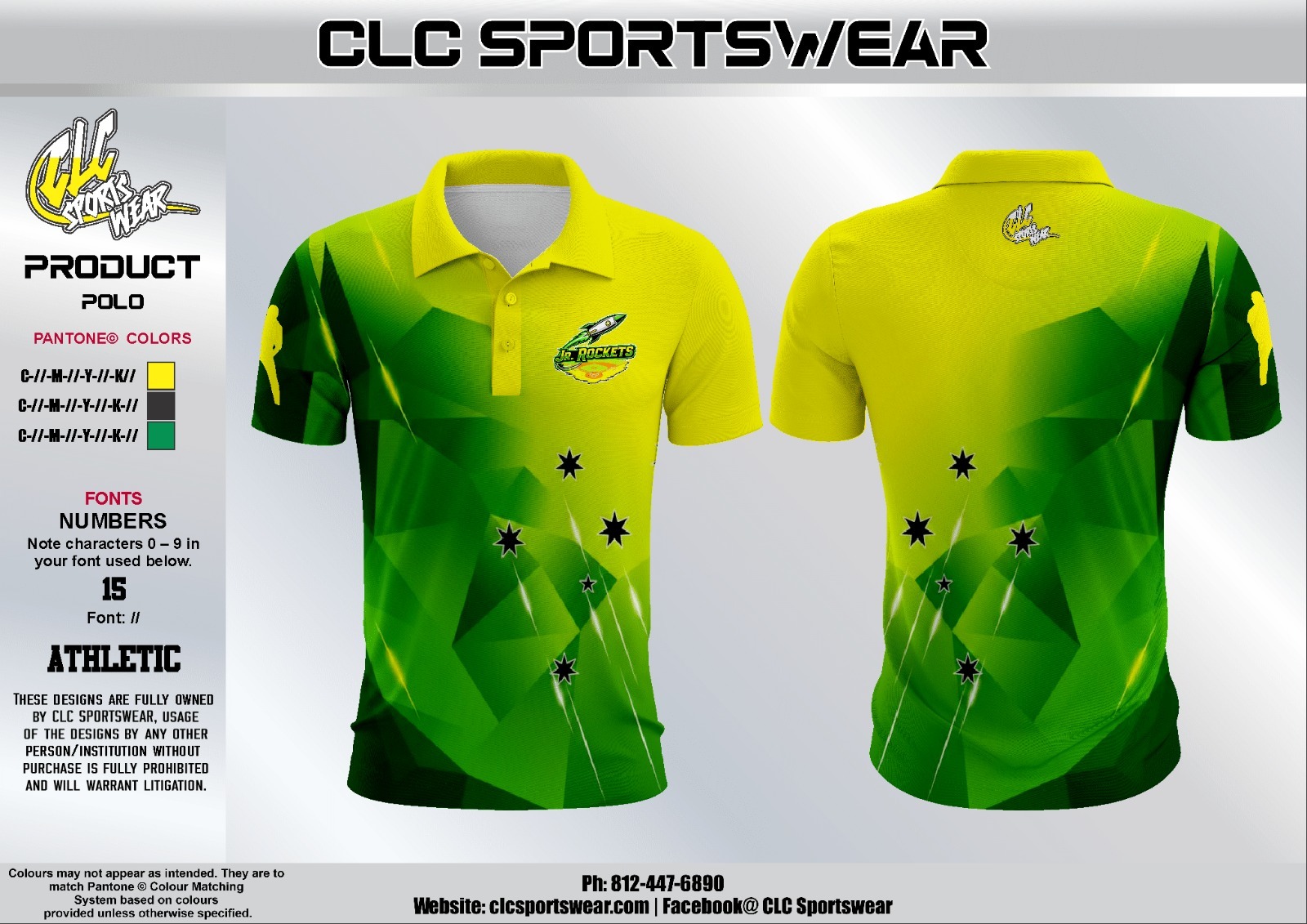 Sharp JR. Rockets polo with green/yellow geometric fade and left-chest team markideal for coaches, staff, and travel-day team wear.