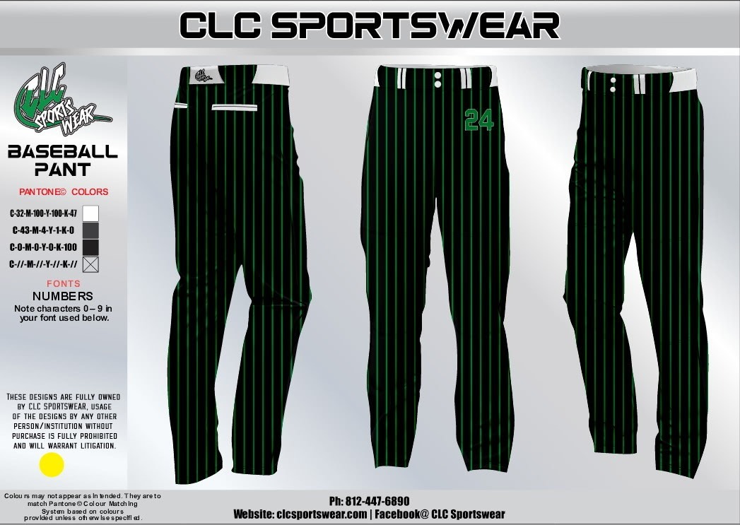 Black baseball pants with vertical green pinstripes and white belt detail.