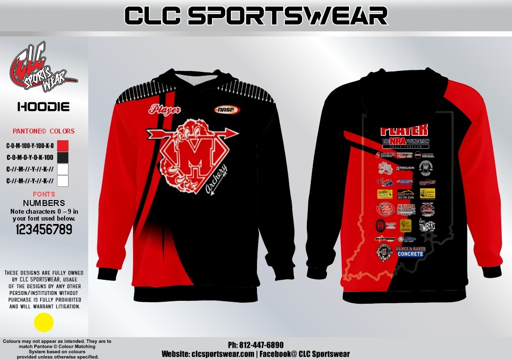 Command attention with this striking Madison Archery Cubs hoodie featuring an innovative diagonal design from CLC Sportswear. The predominantly black body is dramatically accented by bold red diagonal panels that sweep across the chest and sleeves, creating a modern athletic look that stands out in any crowd. The front showcases the Madison Cubs logo with Player text, while the shoulders feature eye-catching striped detailing that adds depth and dimension to the design. The back of this hoodie continues the impressive design with I PLAYED text and The NRA Foundation logo prominently displayed above an Indiana state outline filled with sponsor logos, demonstrating the strong support network behind Madison Archery. This hoodie is constructed from premium performance fleece that provides superior warmth while allowing moisture to escape, keeping you comfortable during intense practice sessions or outdoor competitions. The hood features black lining for added style, while the kangaroo pocket provides convenient storage for small essentials. Ribbed cuffs and hem ensure a secure fit that stays in place during movement. This hoodie perfectly balances bold design with practical functionality, making it ideal for athletes who want to make a statement.
