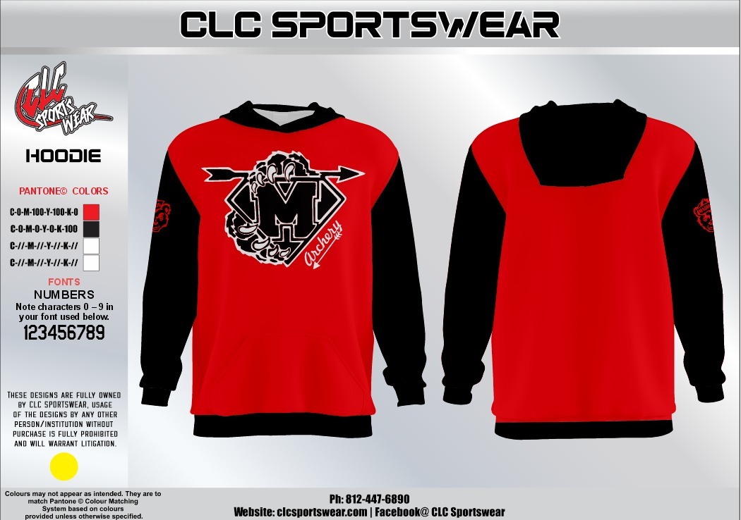 Bold red hoodie with black sleeves and hood featuring the Madison Cubs archery logo.