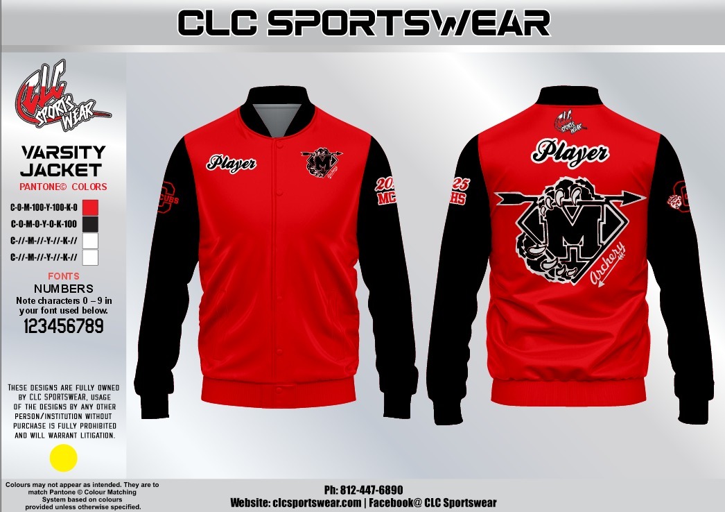 Make a lasting impression with this exceptional Madison Archery Cubs varsity jacket from CLC Sportswear, representing the pinnacle of team apparel craftsmanship. The vibrant red wool-blend body creates a bold foundation, while the genuine black leather sleeves add a classic varsity aesthetic that never goes out of style. The front features the Player text and Madison Cubs logo with arrow design, all meticulously embroidered with exceptional detail and dimension. The chest also displays sponsor patches including NASP and Easton, adding authentic credibility to this premium garment. The sleeves feature embroidered text and numbers that can be customized to represent your achievements and team affiliation. The back of this varsity jacket is truly spectacular, showcasing the Player text above the large, intricately embroidered Madison Cubs logo with arrow design and Madison script text. Below this, an outline of Indiana is filled with embroidered sponsor logos, creating a comprehensive display of the program supporters and community backing. Every logo and text element is fully embroidered rather than printed, ensuring exceptional durability and a premium appearance that will last for years. The jacket features a classic snap-front closure with striped ribbed collar, cuffs, and hem that provide a secure, comfortable fit while adding to the traditional varsity aesthetic. Interior pockets offer convenient storage for essentials, while the quilted lining provides additional warmth without adding bulk. This varsity jacket represents a significant investment in quality team apparel that will serve as a treasured keepsake of your time with Madison Archery, perfect for competitions, team events, school functions, or any occasion where you want to showcase your achievements and team pride with distinction.