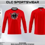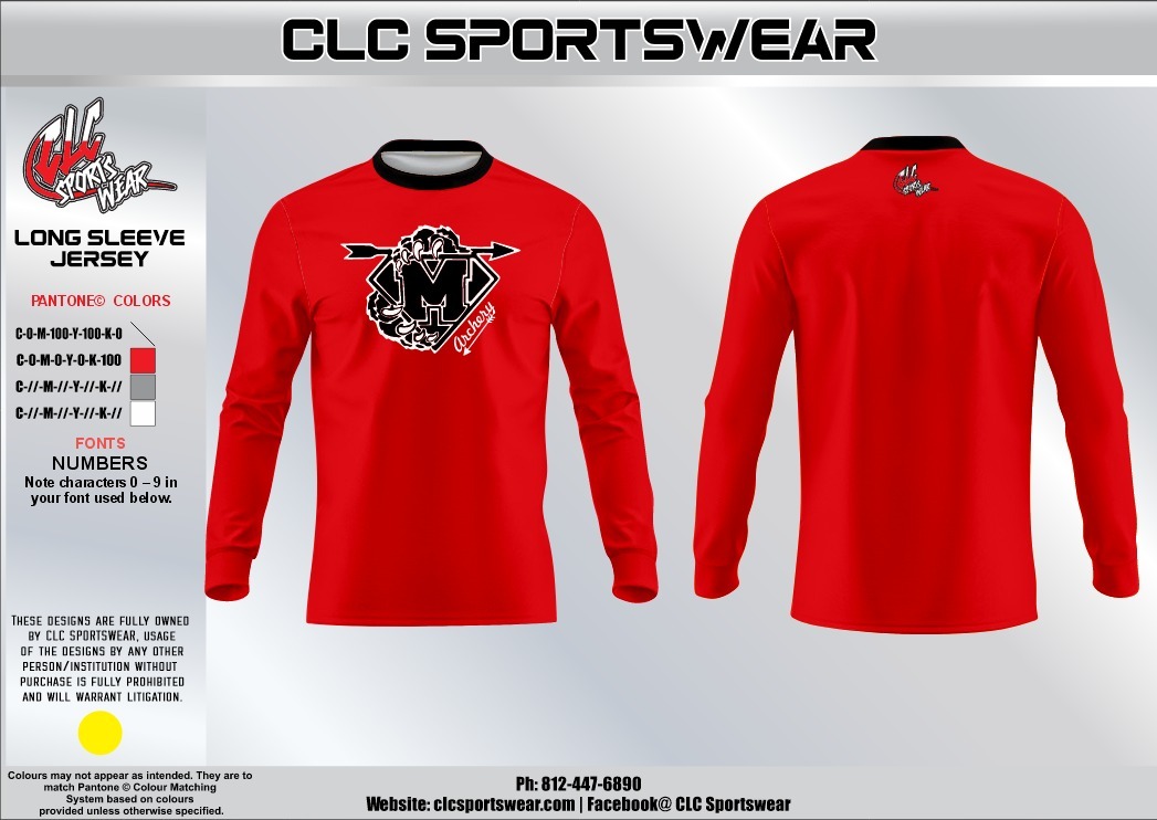 Premium red long sleeve jersey with black collar trim and Madison Cubs logo.