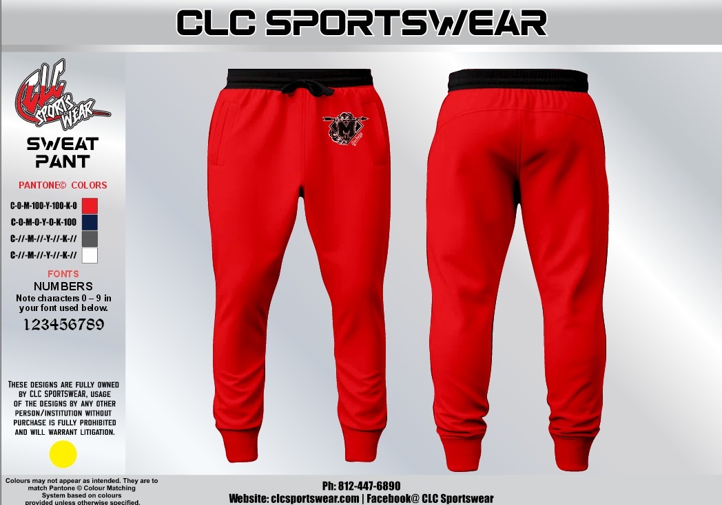 Bold red sweatpants with black waistband featuring the Madison Cubs archery logo.