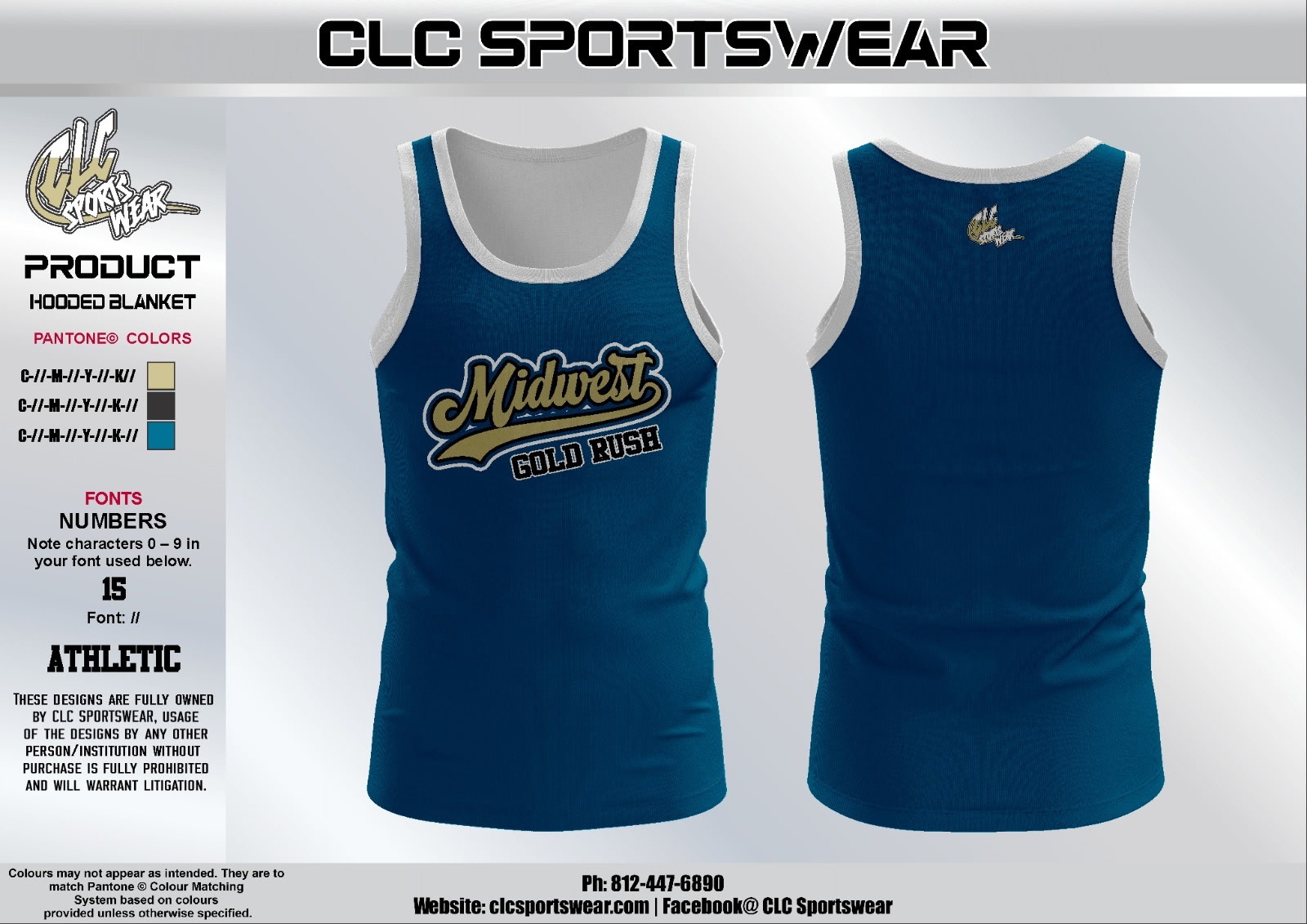 Premium Blue racerback tank top with Midwest Gold Rush logo, moisture-wicking fabric, and contrasting white trim. Perfect for workouts and game days.