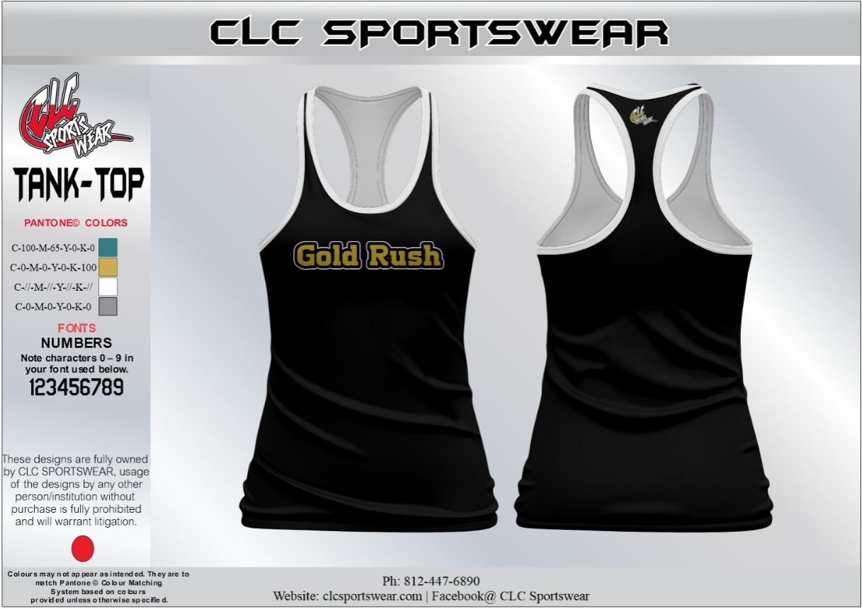Premium Black racerback tank top with Midwest Gold Rush logo, moisture-wicking fabric, and contrasting white trim. Perfect for workouts and game days.