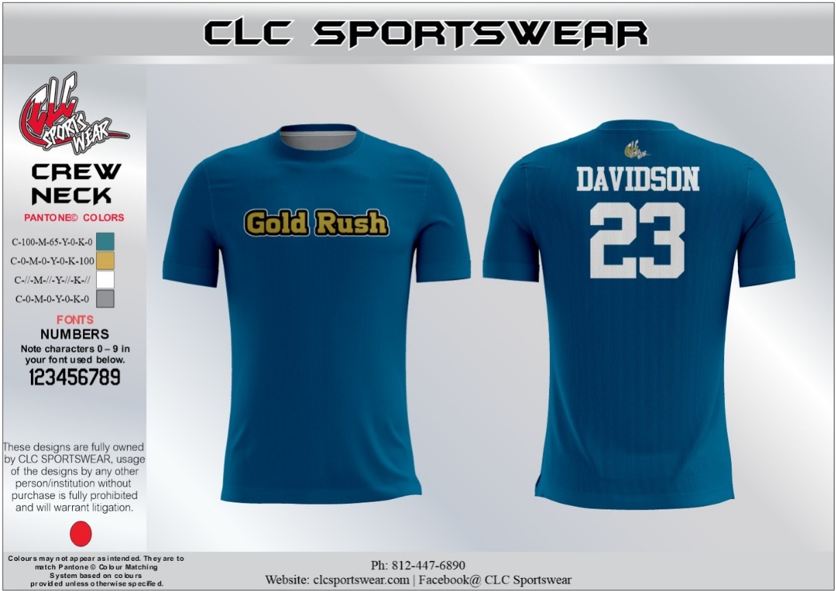 Classic Blue crew neck shirt with Midwest Gold Rush logo and Davidson 23 back print. Soft cotton-blend fabric for all-day comfort and team pride.