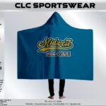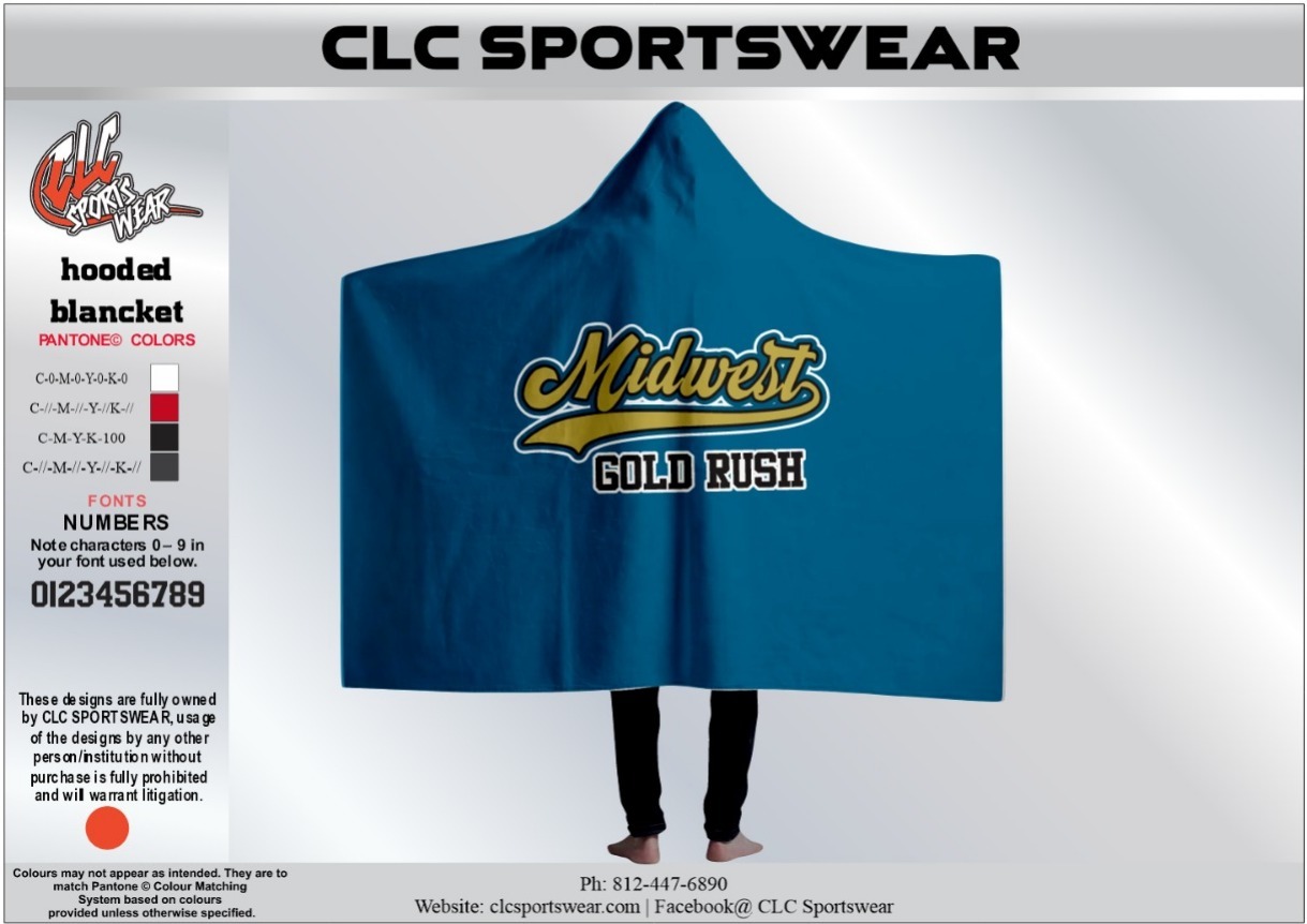 Luxurious Blue hooded blanket with Midwest Gold Rush logo, ultra-soft fabric, and oversized design. Ultimate comfort for game nights and lounging.