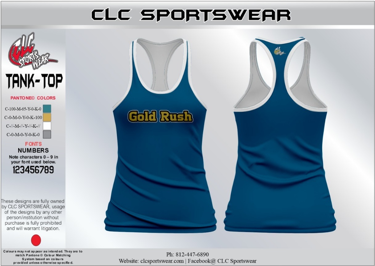 Premium Blue racerback tank top with Midwest Gold Rush logo, moisture-wicking fabric, and contrasting white trim. Perfect for workouts and game days.