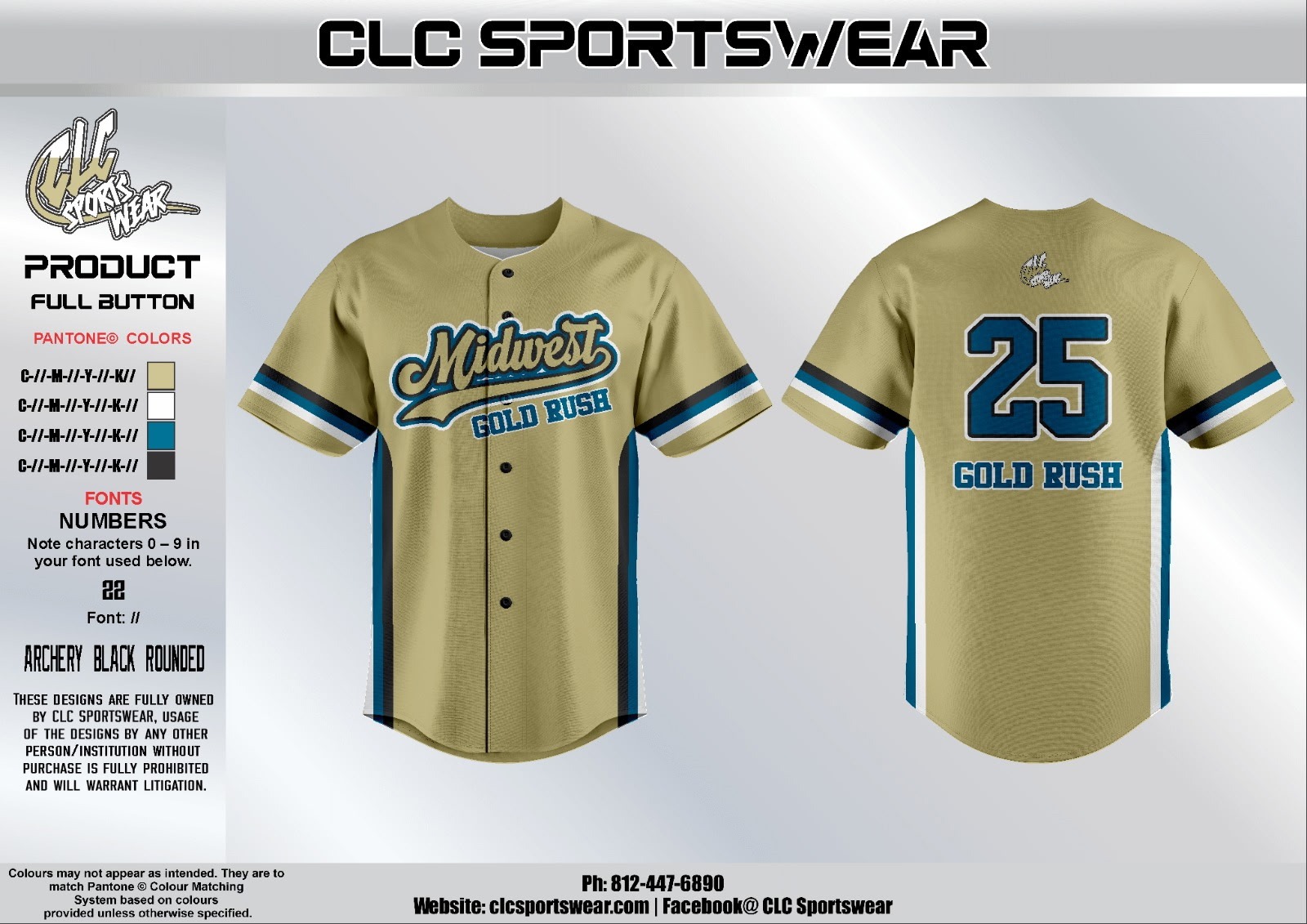 Authentic gold baseball jersey with Midwest Gold Rush script, full-button front, number 25 back print, and striped sleeve details. Perfect for game day and fan wear.
