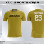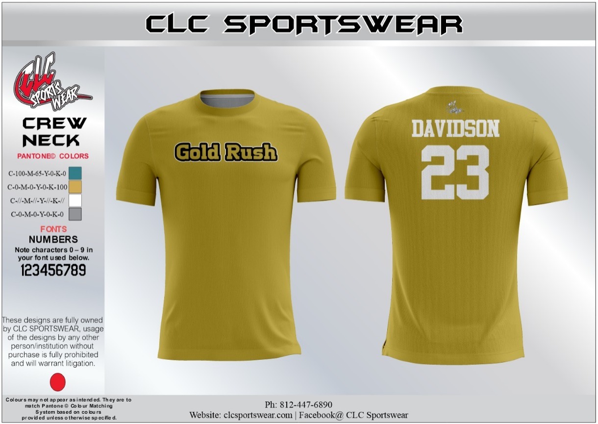 Classic Gold crew neck shirt with Midwest Gold Rush logo and Davidson 23 back print. Soft cotton-blend fabric for all-day comfort and team pride.