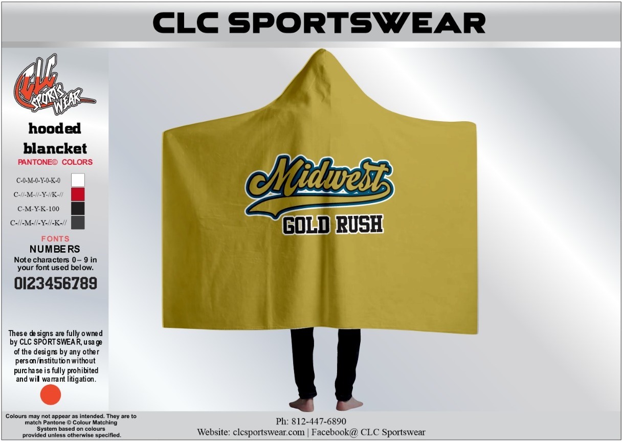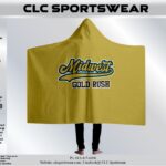 Luxurious Gold hooded blanket with Midwest Gold Rush logo, ultra-soft fabric, and oversized design. Ultimate comfort for game nights and lounging.