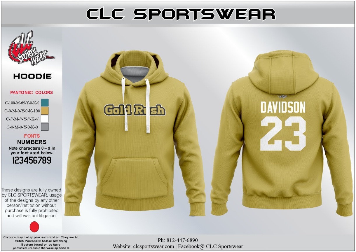 Bundle up in team spirit with this cozy Gold Pullover Hoodie featuring the bold Gold Rush logo. Crafted from premium fleece-lined fabric, this hoodie provides exceptional warmth and comfort during chilly game days, early morning practices, or cool evenings. The spacious kangaroo pocket offers convenient storage for your essentials or a warm refuge for cold hands, while the adjustable drawstring hood allows for customizable coverage. The front showcases the distinctive Gold Rush wordmark, and the back displays ‘DAVIDSON 23’ in bold athletic lettering.