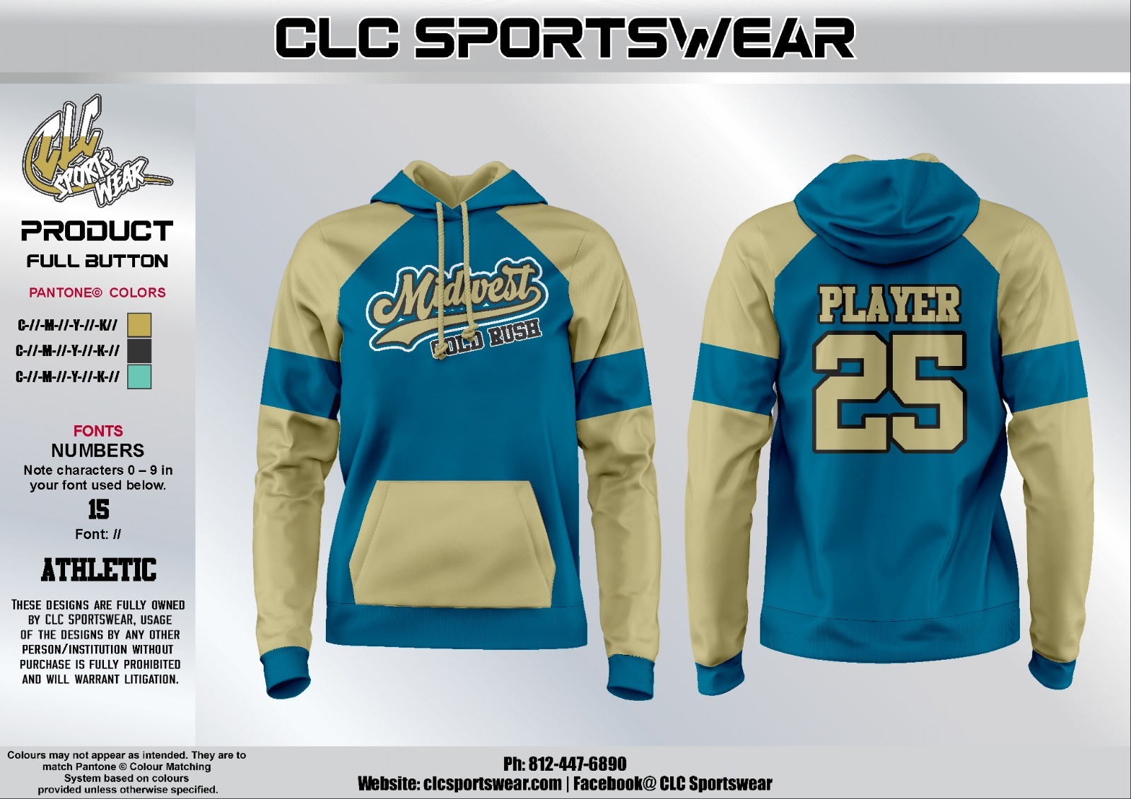 Innovative Teal full-button hoodie with raglan sleeves, Midwest Gold Rush logo, Player 25 back print, and fleece lining. Unique hybrid design for ultimate comfort.