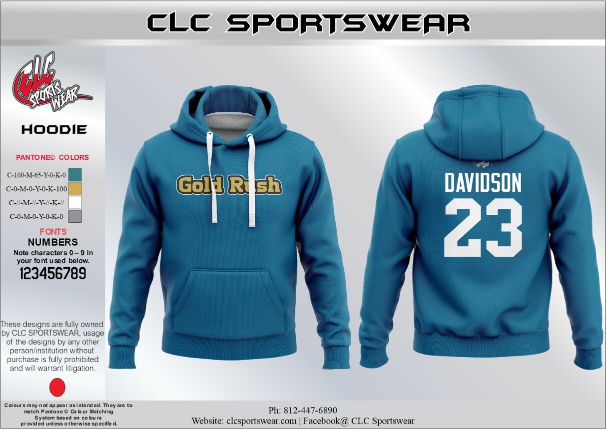 Premium Teal pullover hoodie with Gold Rush logo, Davidson 23 back print, fleece lining, and kangaroo pocket. Ultimate warmth for dedicated fans.