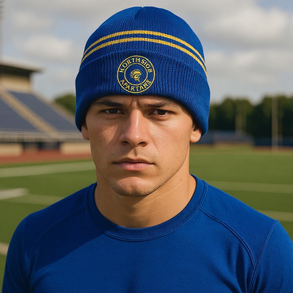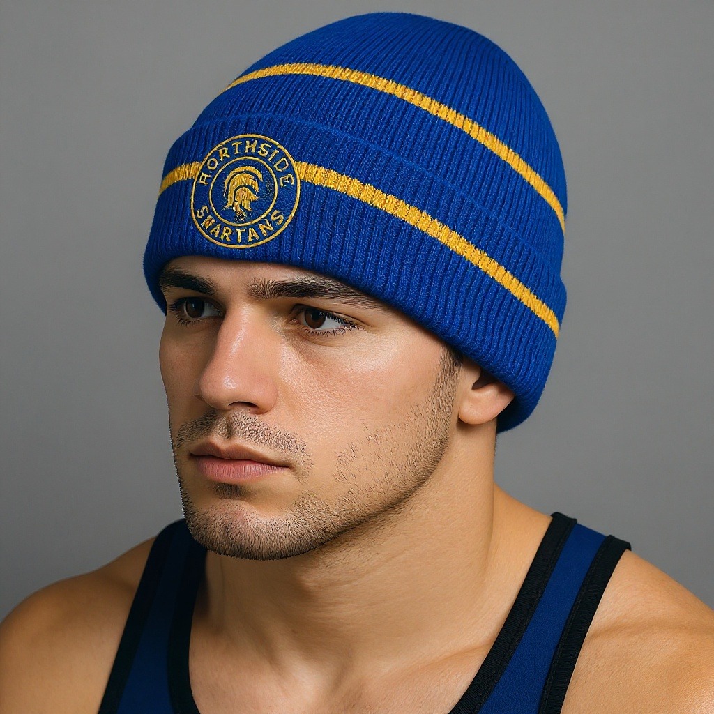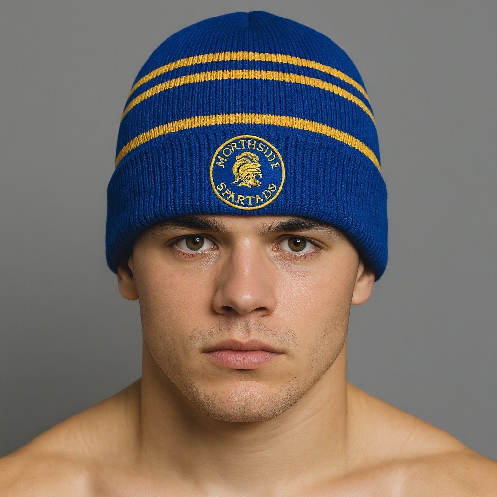 Northside Spartans winter beanie with embroidered logo and blue/gold stripes.