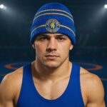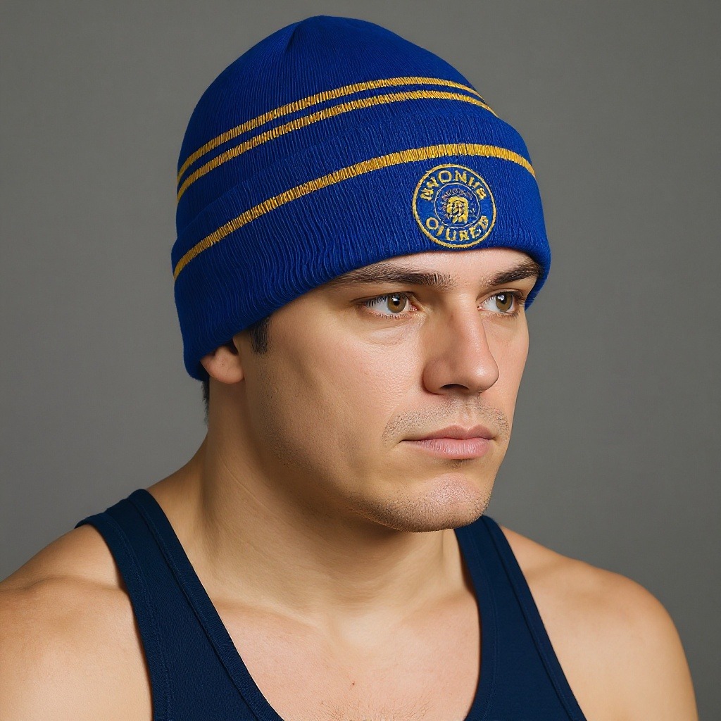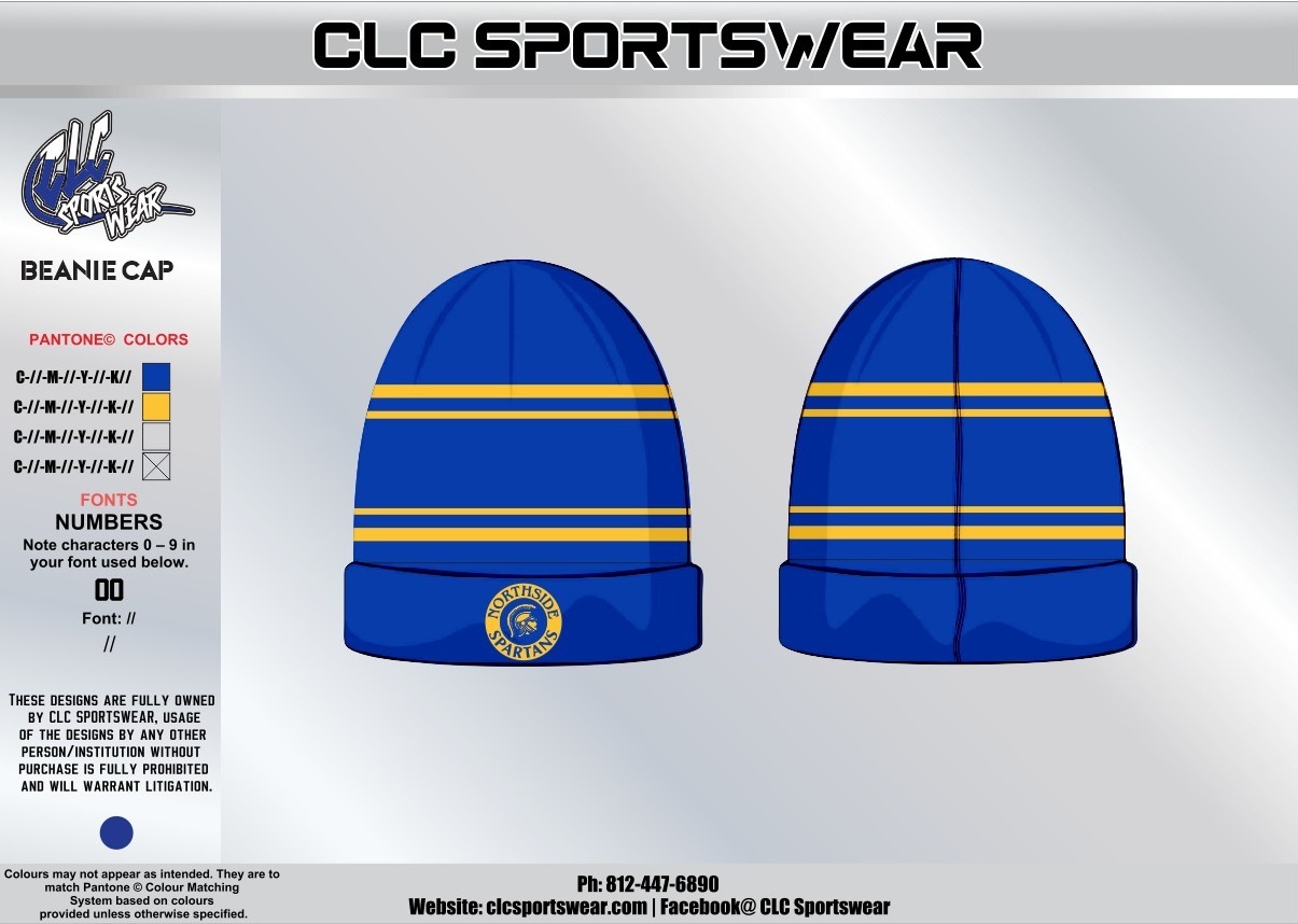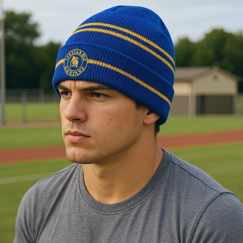 Northside Spartans winter beanie with embroidered logo and blue/gold stripes.
