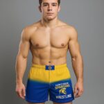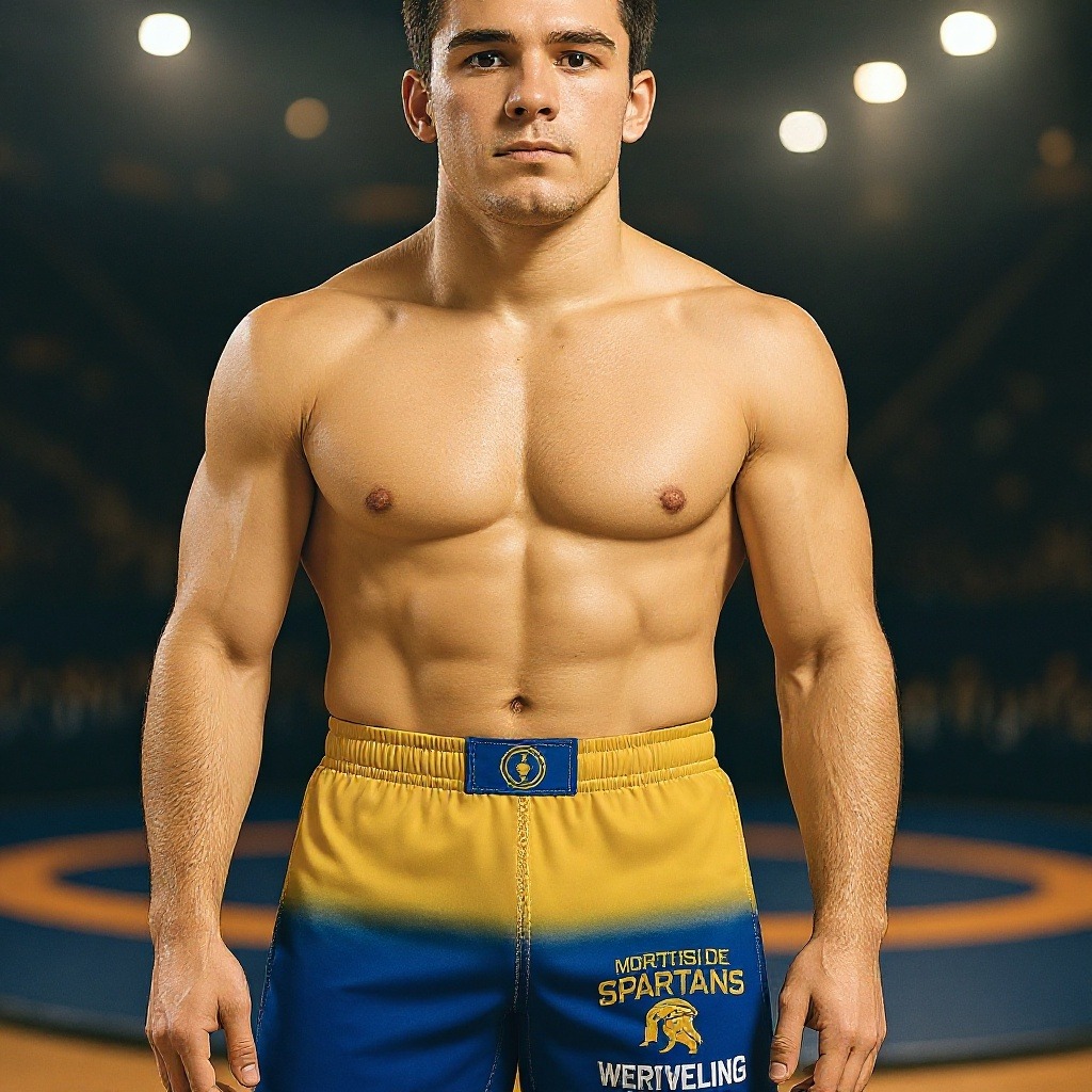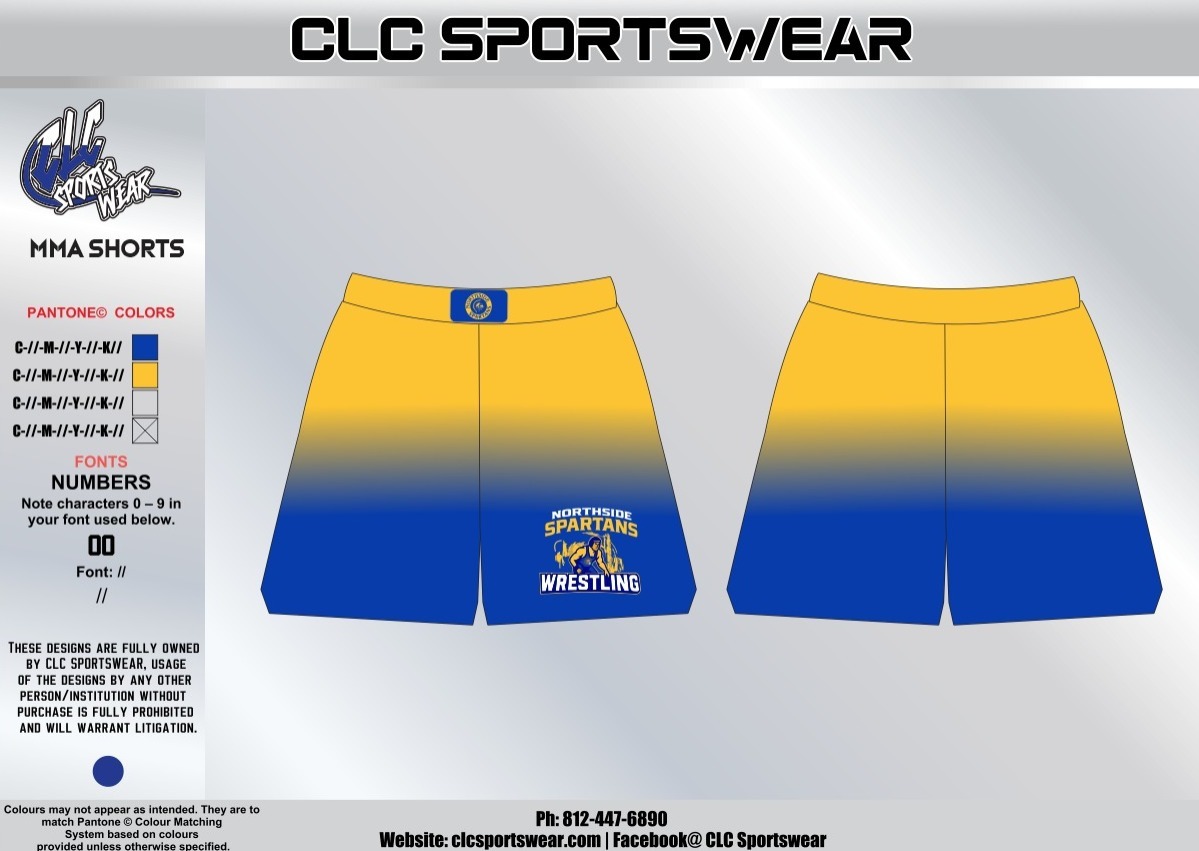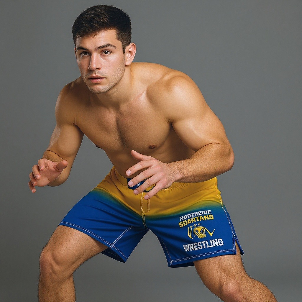 Engineered for combat sports, the Northside Spartans Gradient MMA Shorts blend visual intensity with peak performance. Featuring a gradient fade from gold to blue, and adorned with the Northside Spartans Wrestling logo, these shorts exude power and pride. Lightweight and built for flexibility, they allow unrestricted movement during training and matches.