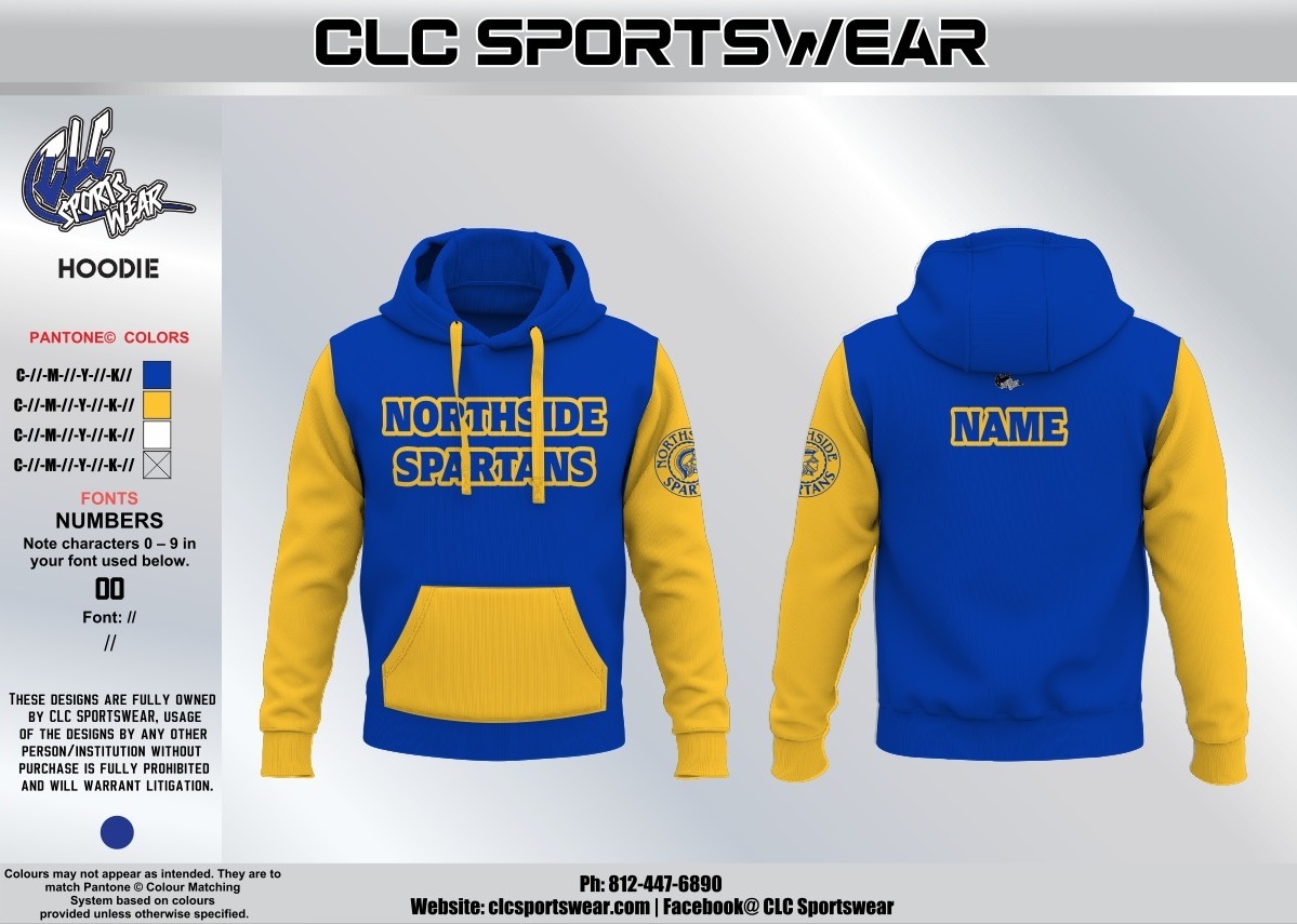 Classic pullover hoodie with blue body and gold sleeves, featuring bold Northside Spartans text and customizable name on back.