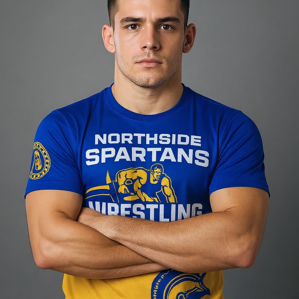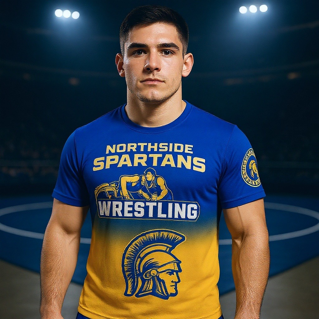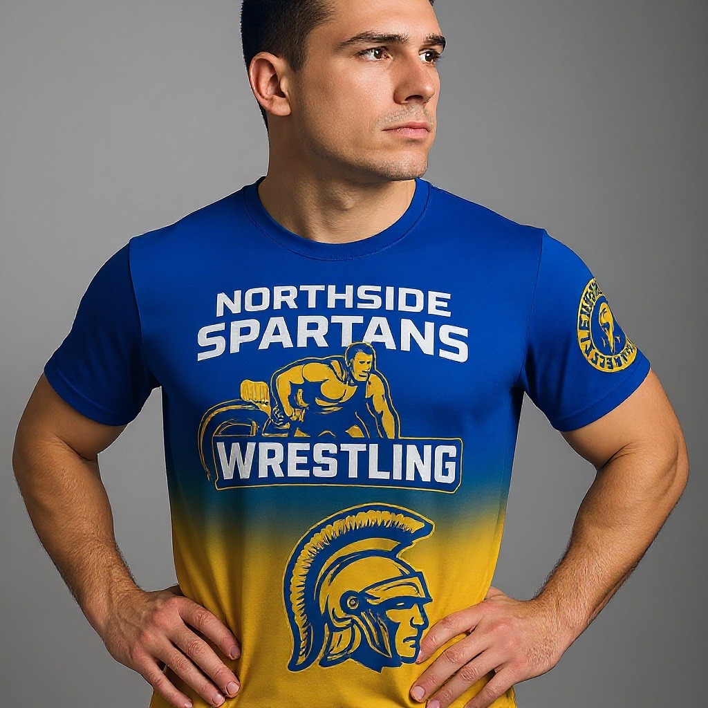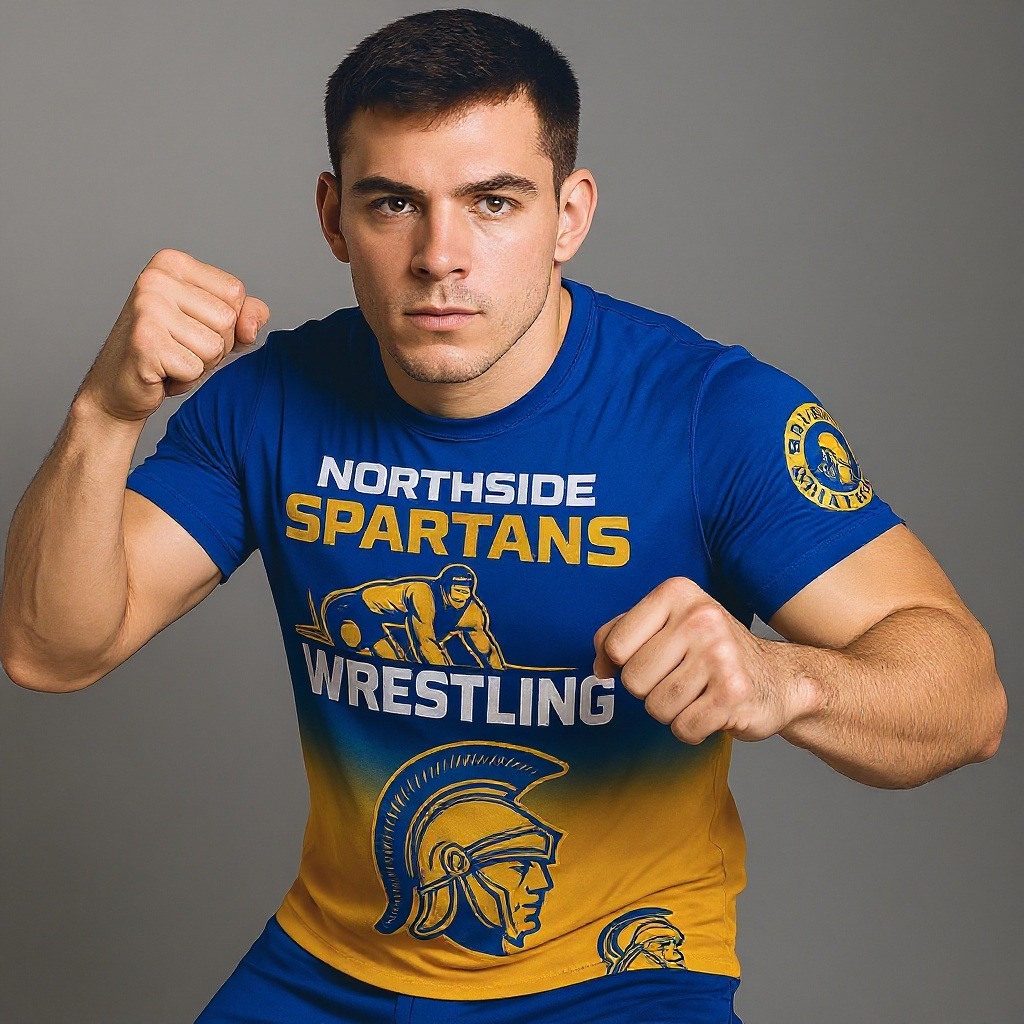 Show your support for Northside Spartans Wrestling in this premium short sleeve jersey. The design features a smooth blue-to-gold gradient, enhanced with bold Northside Spartans text, a powerful wrestling graphic, and the signature Spartan helmet across the front. Made from high-performance fabric, it’s designed for breathability and all-day comfort whether you’re on the mat or in the stands.