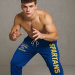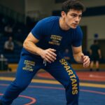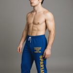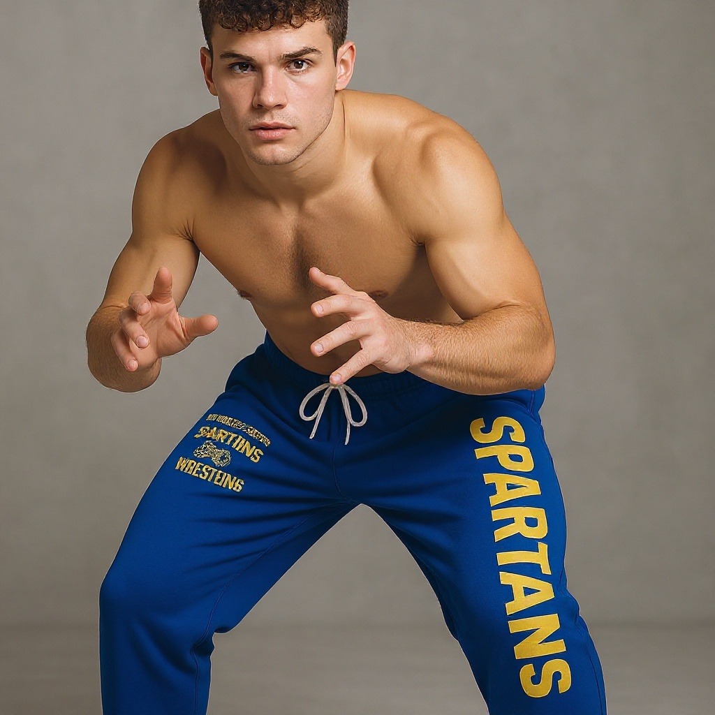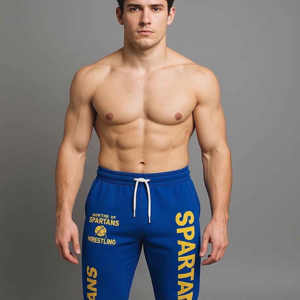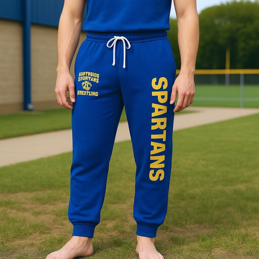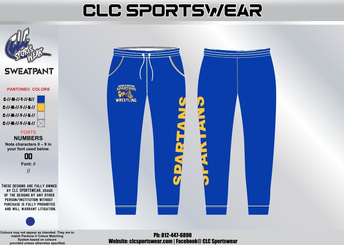 Blue Northside Spartans wrestling sweatpants with bold side print.