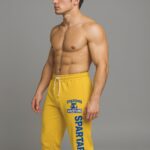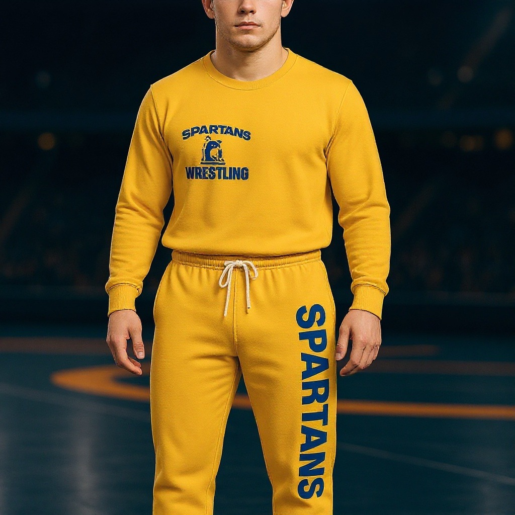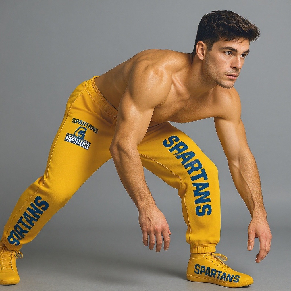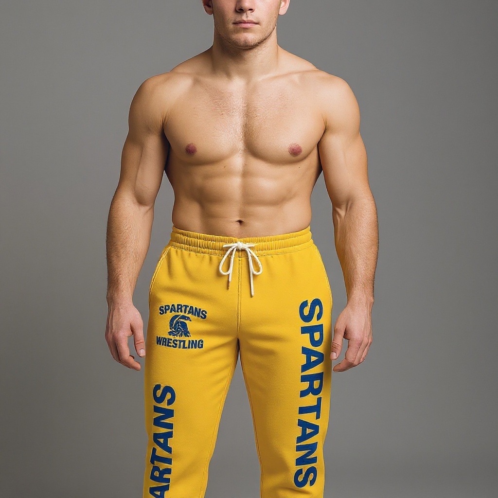 Gold wrestling sweatpants with SPARTANS leg graphic and logo.