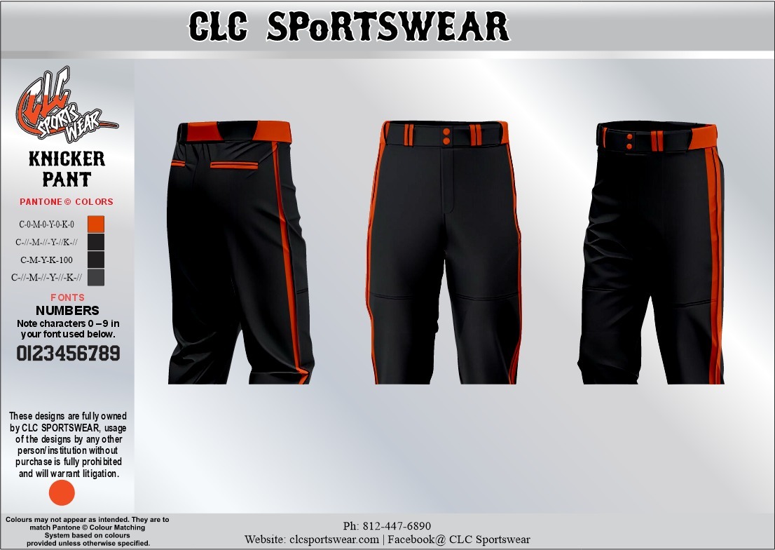 Tags baseball pants, black pants, CLC Sportswear, knickers, orange piping, Orioles, Orioles Baseball, team uniform, uniform pants