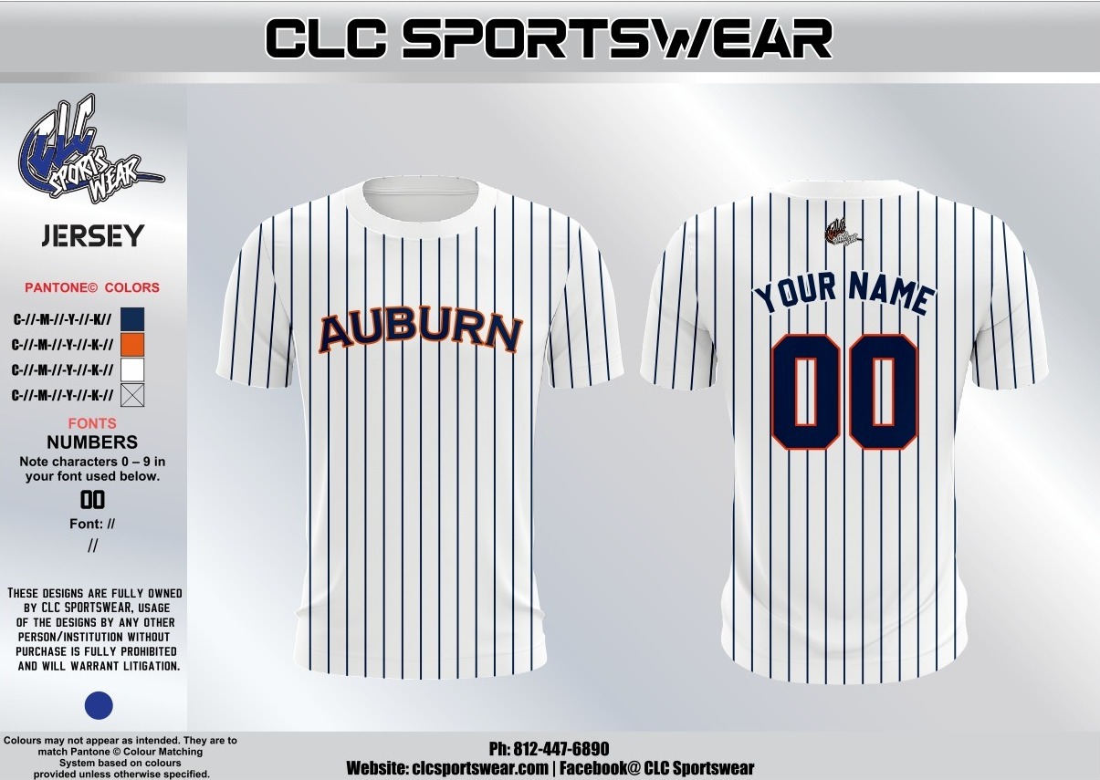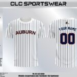 This stunning white pinstripe jersey brings classic baseball style to South Tyler County Little League, featuring bold “AUBURN” lettering on the front in navy blue with an orange outline. The vertical navy pinstripes run the full length of the jersey, giving it an authentic, professional baseball aesthetic. Designed by CLC Sportswear, this jersey is a nod to traditional baseball uniforms while incorporating modern sublimation printing for superior color quality and durability. The crew neck and short sleeves offer a comfortable, athletic fit for players of all sizes.