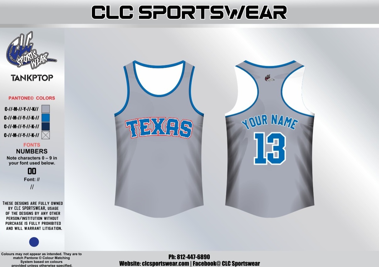 Custom gray racerback tank top with bold blue ‘TEXAS’ lettering on the front and personalized name/number on the back. Designed for South Tyler County Little League by CLC Sportswear.