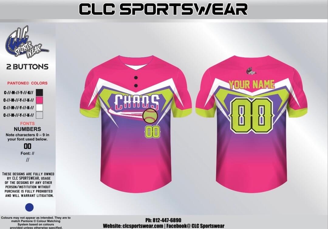 The Team Chaos Chevron 2-Button Jersey brings geometric precision and explosive color to your team uniform collection. This eye-catching jersey features a sophisticated chevron pattern that creates dynamic visual movement across the chest and torso, with hot pink as the dominant color beautifully accented by deep purple and electric lime green angular shapes. The Team Chaos logo with its accompanying softball graphic sits prominently at center chest, perfectly integrated into the chevron design. The lime green sleeves provide bold contrast while maintaining the jersey’s cohesive color story.
